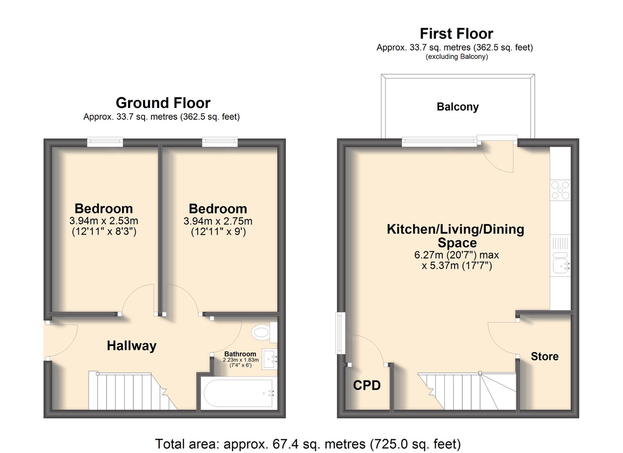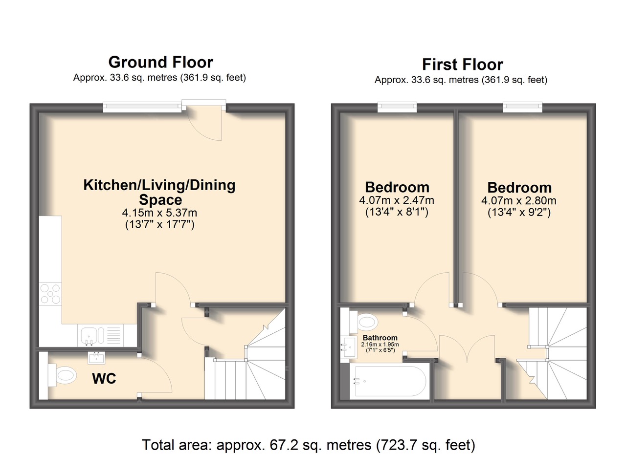 The ground floor features a bright living room at the front, with an open-plan kitchen and dining area at the rear, plus a downstairs WC. Upstairs, there are two good-sized bedrooms and a family bathroom.