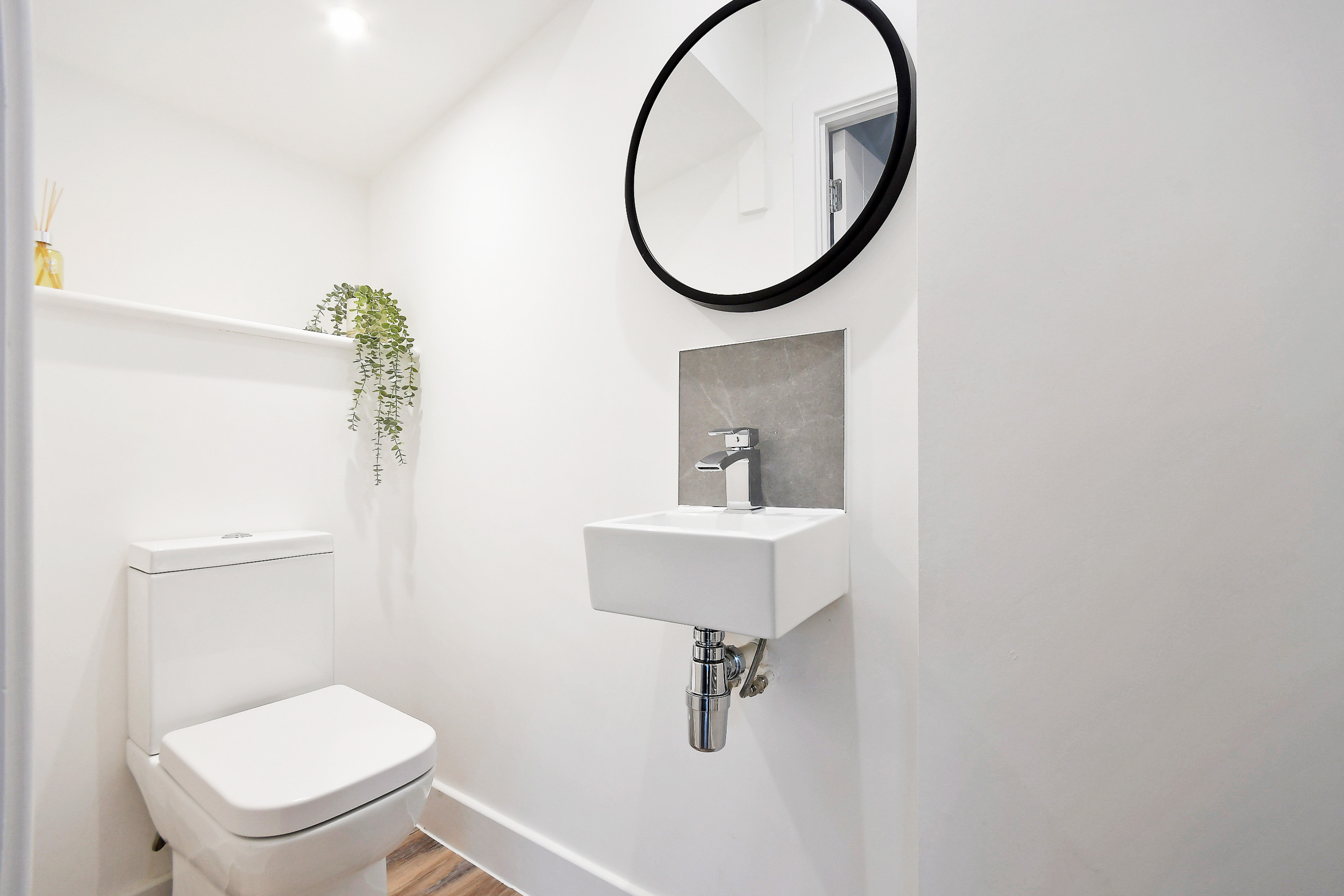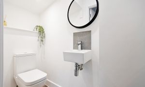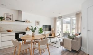 Enter from the side into a hallway with a downstairs WC and a spacious living room. At the rear, there’s an open-plan kitchen and dining area with plenty of natural light and gorgeous views on the communal gardens.