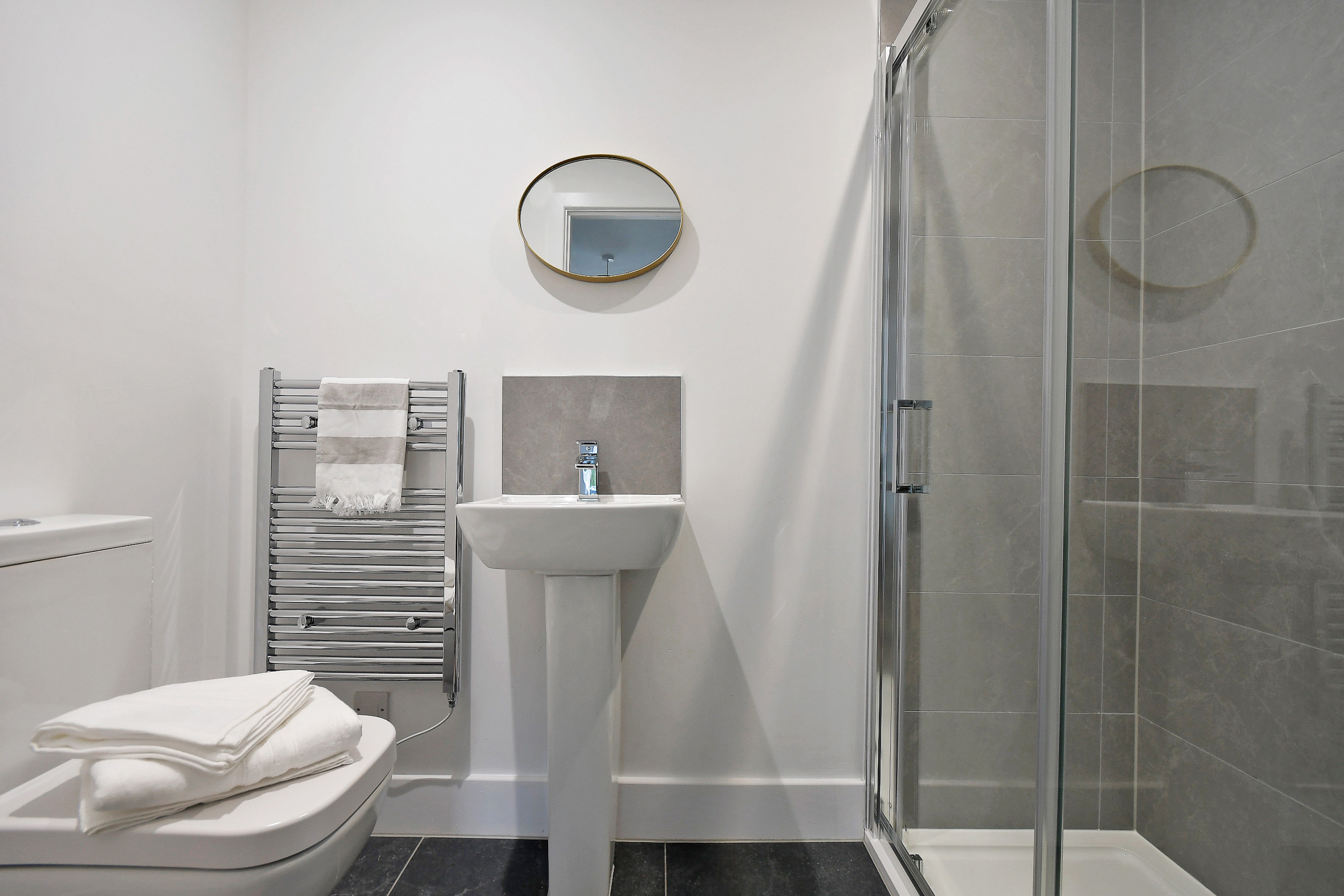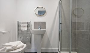 Large windows bring in plenty of natural light. The kitchen includes integrated appliances, and the bathroom is finished with modern fittings and a heated towel rail.