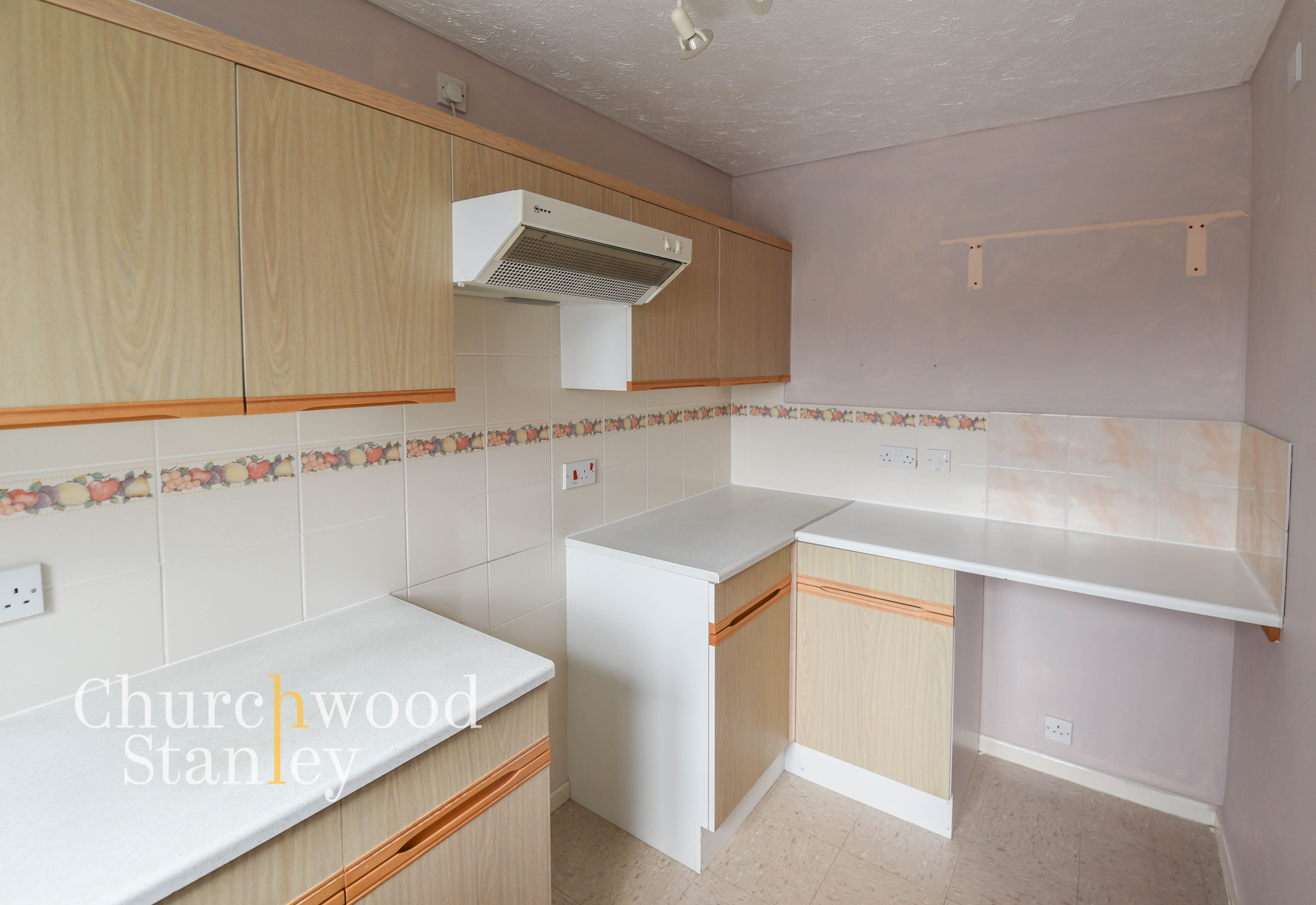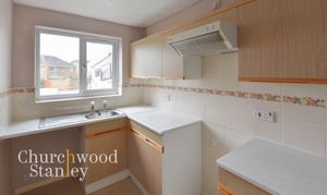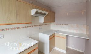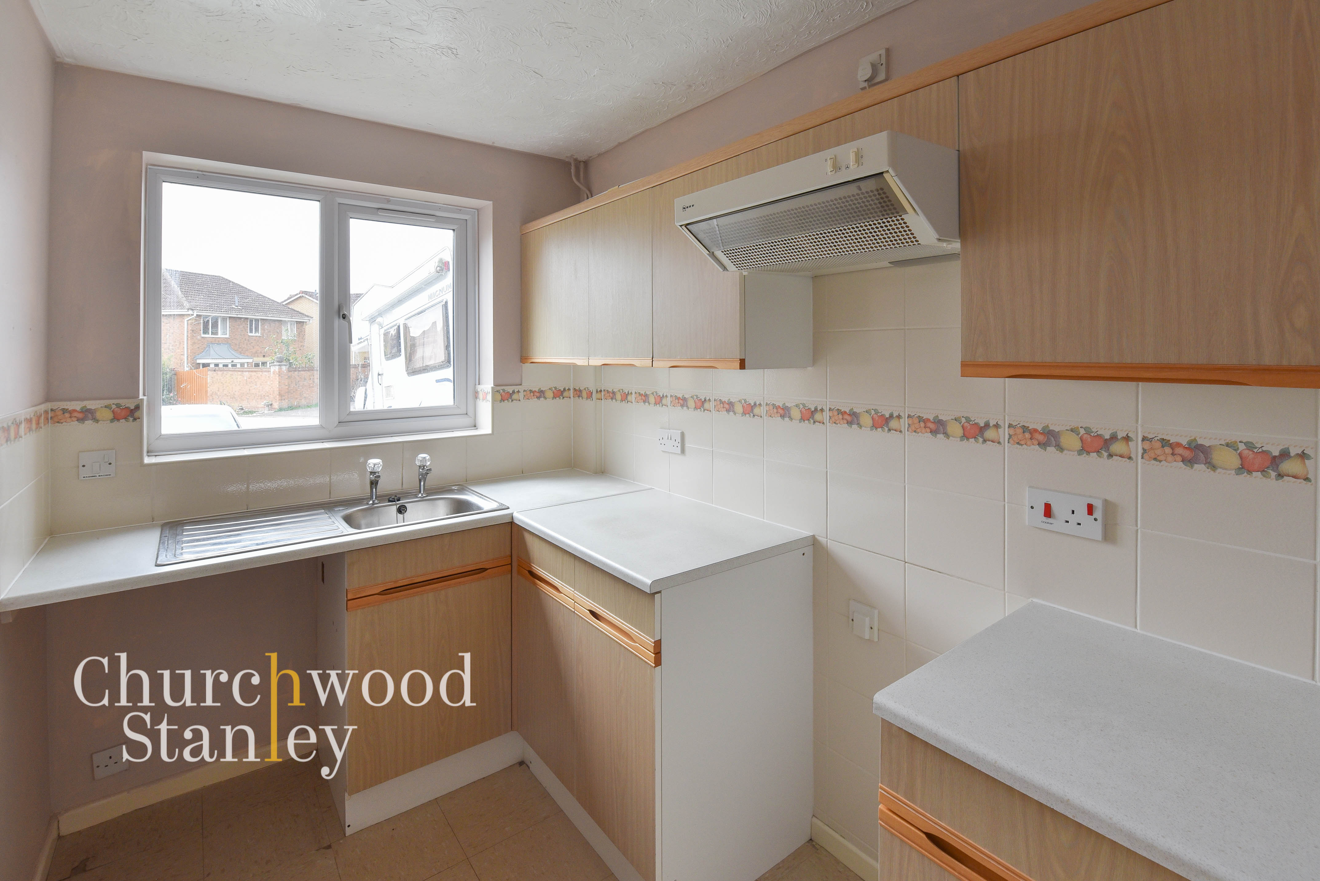 Set to the front of the home, the kitchen enjoys a pleasant outlook and a practical layout that makes good use of the available space. The cabinetry offers ample storage with matching wall and base units, complemented by light worktops and tiled splashbacks finished with a decorative border. There’s space for essential appliances, including a cooker and under-counter white goods, while the stainless-steel sink sits neatly below a large window that brings in plenty of natural light. The neutral tones give the room a bright, functional feel with excellent potential for personalisation or modernisation to suit individual taste.