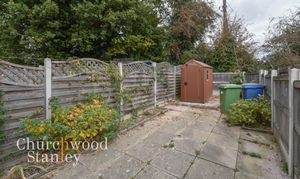 The rear garden offers a low-maintenance outdoor space, mainly paved and enclosed by fencing for privacy. A practical storage shed sits to one side, with climbing plants adding a touch of greenery along the boundary. There’s good space for outdoor seating or container planting, making it a flexible area to enjoy with minimal upkeep. A gated side access provides a convenient route to the front of the property.