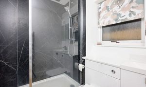 Adjacent to the living room is a stylish kitchen with space for a dining area. It features grey shaker-style units, white worktops with built-in lighting, and a range of integrated appliances. The appealing double bedroom boasts generous proportions and a built-in wardrobe. A contemporary shower room with a large walk-in shower completes the accommodation.