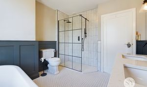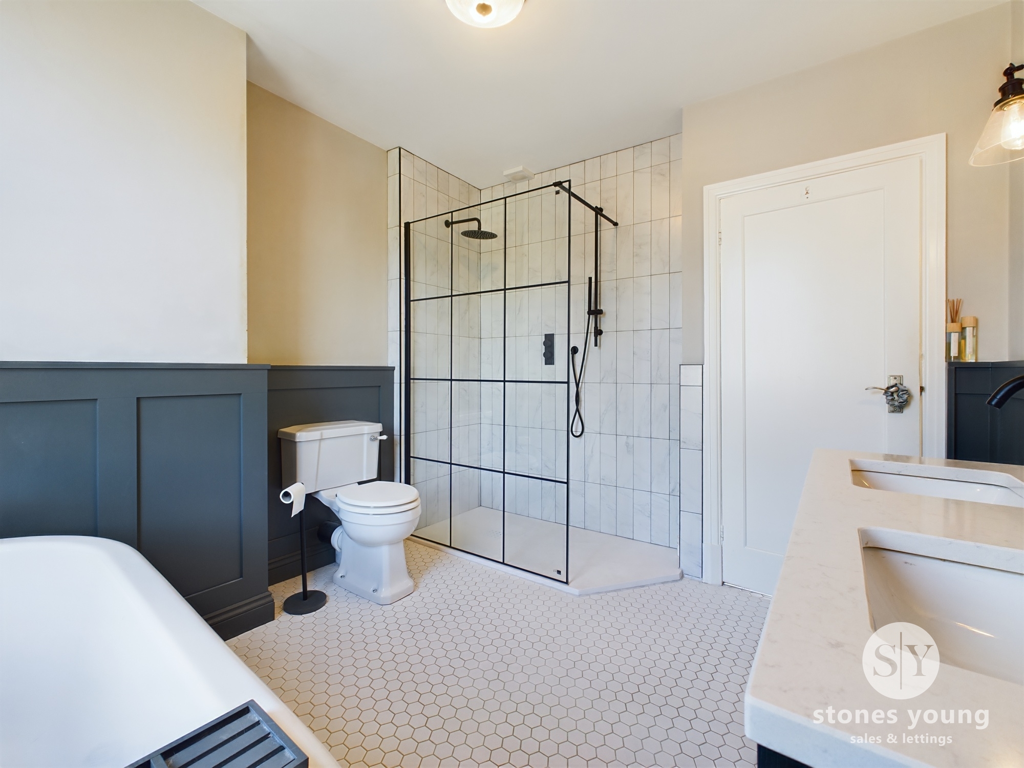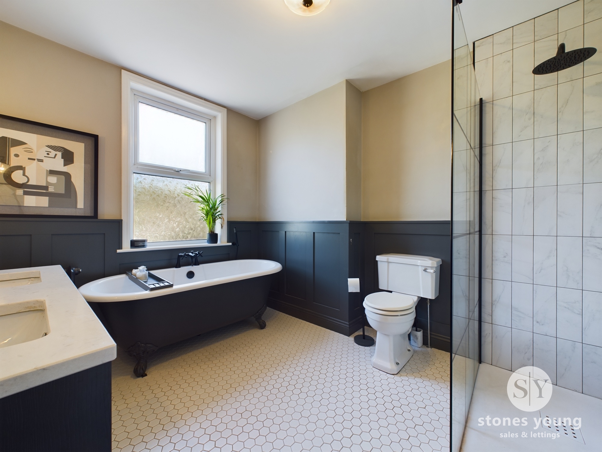 Four piece suite with freestanding roll top bath, walk in shower, couples sink housed in vanity unit and WC. panel radiator, tiled flooring, upvc double glazed frosted window