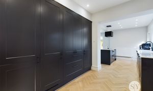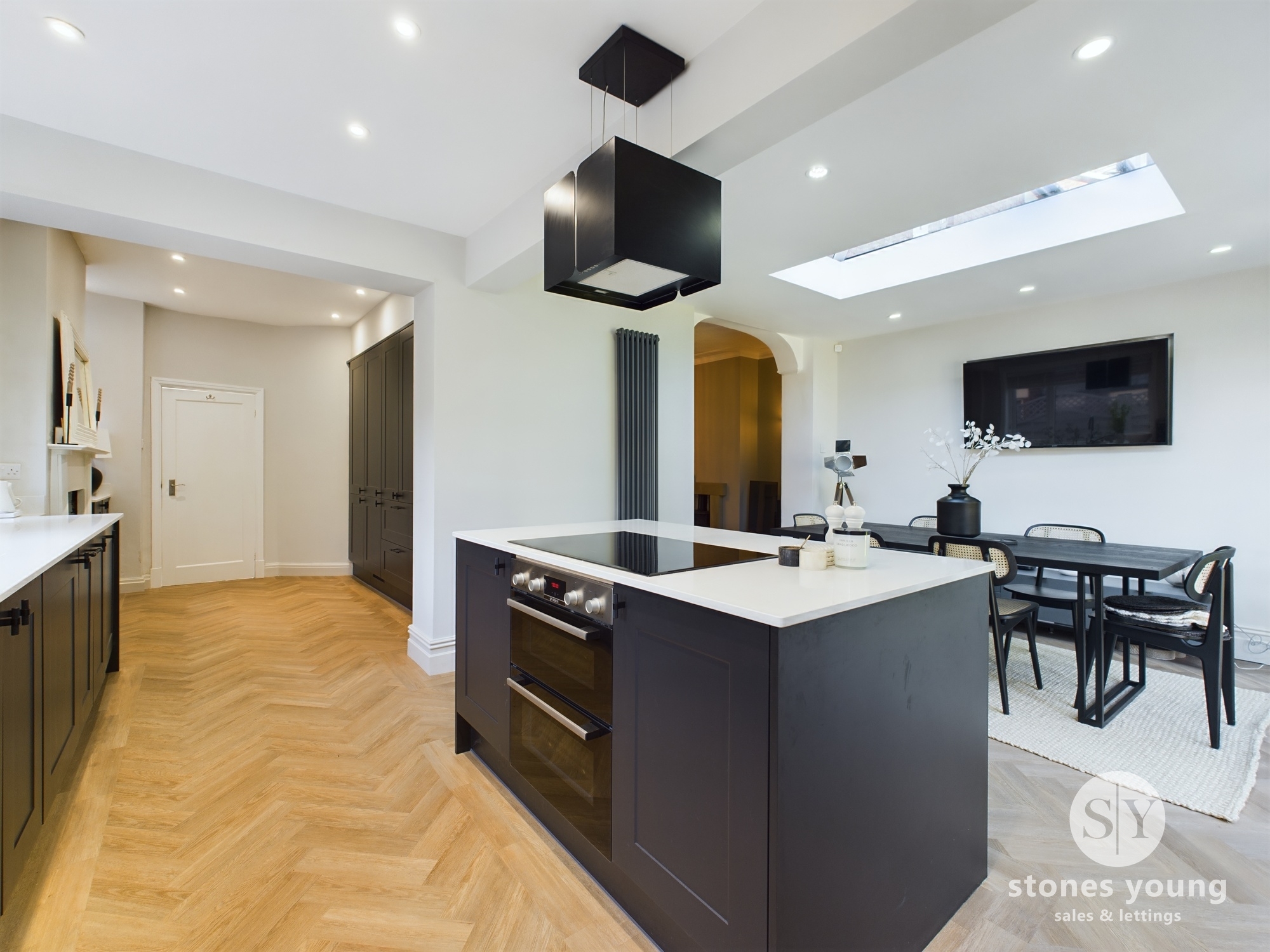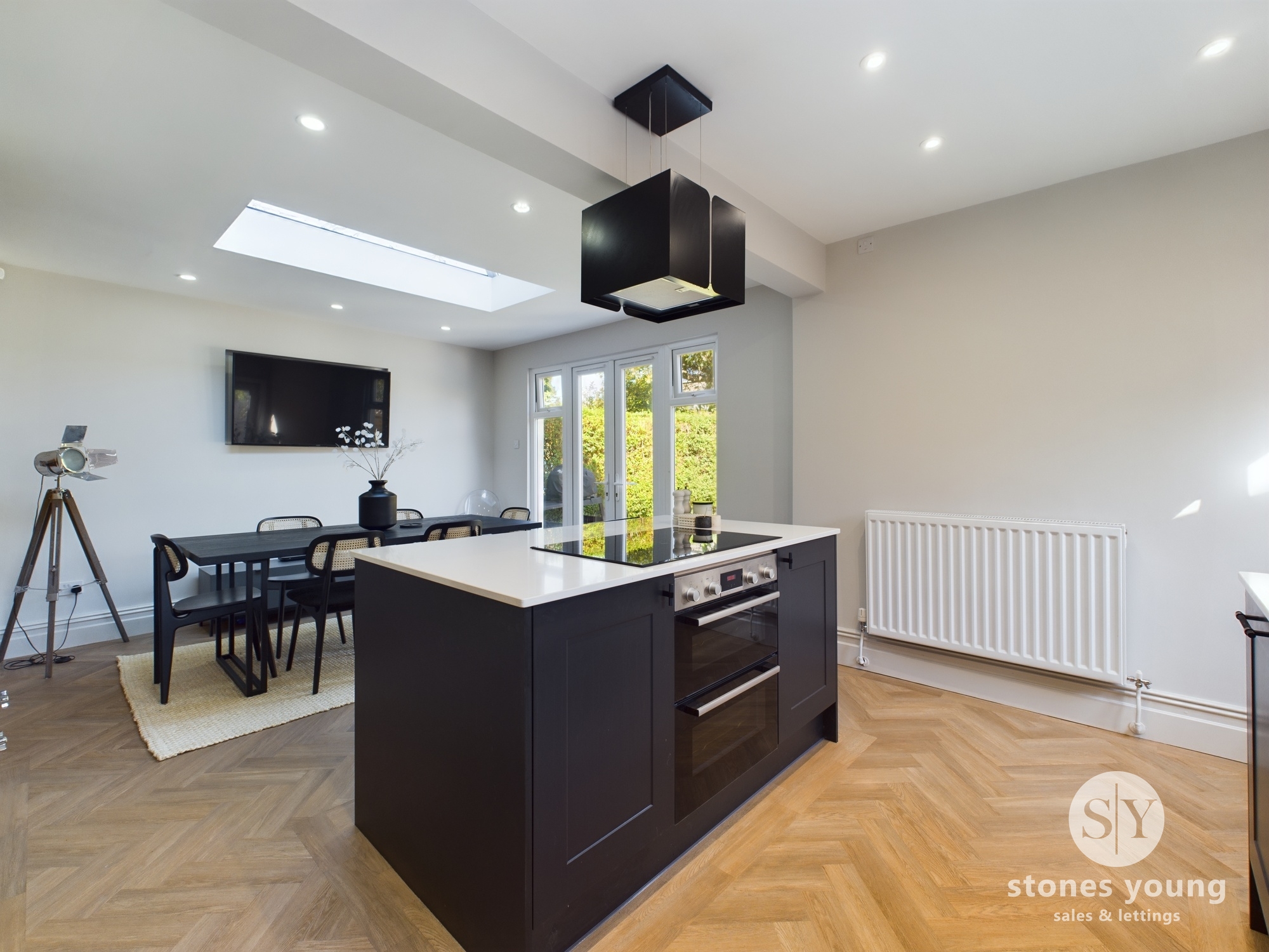 Range of fitted wall and base units with contrasting quartz worksurfaces, integrated fridge and freezer, integrated washing machine and tumble dryer, integrated dishwasher. Kitchen island with fitted oven, induction hob and extractor, Karndean flooring, feature fireplace, designer radiator, panel radiator, wall mounted TV point, four upvc double glazed windows, upvc back door, upvc double glazed French doors to garden, upvc double glazed ceiling lantern