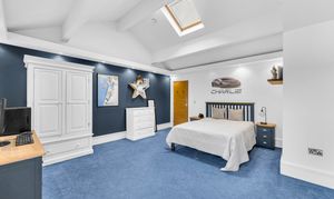 Follow the oak staircase onto the bright, first-floor galleried landing, where a fitted grey carpet, ceiling spots and white walls continue in all four super-spacious double bedrooms, except bedroom five, which is fitted with a blue carpet to echo the two-tone walls.
