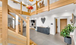 Meanwhile, a beautiful solid oak half-landing staircase and bannister hugging a statement multi-pendant light create a striking first impression. You’ll also find an identically decorated hallway with access to a stylish WC, the double garage, and private stairs to an en suite double bedroom.