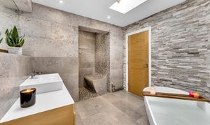 Both a great size, bedrooms four and five share an opulent spa-inspired family bathroom boasting stone-effect wall and floor tiles, with mosaic tiling to a recessed rainfall wet-room shower with integrated seat, a double-ended tub with waterfall tap, and a modern wall-hung toilet and vanity unit with a large square countertop basin. A large recessed mirror also reflects the light from the privacy-enhancing Velux windows.