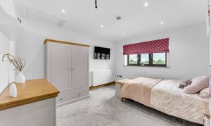 The master lies to the front, warmed by a sleek white flat-panelled radiator and further illuminated by a Velux skylight and a full-height picture window with countryside views. This super-king double also benefits from a fully fitted walk-in dressing room and a hotel-style en suite with grey stone-effect floor and wall tiles, a big walk-in rainfall shower, a wall-mounted vanity and countertop basin, a heated towel rail, and a wall-hung loo.