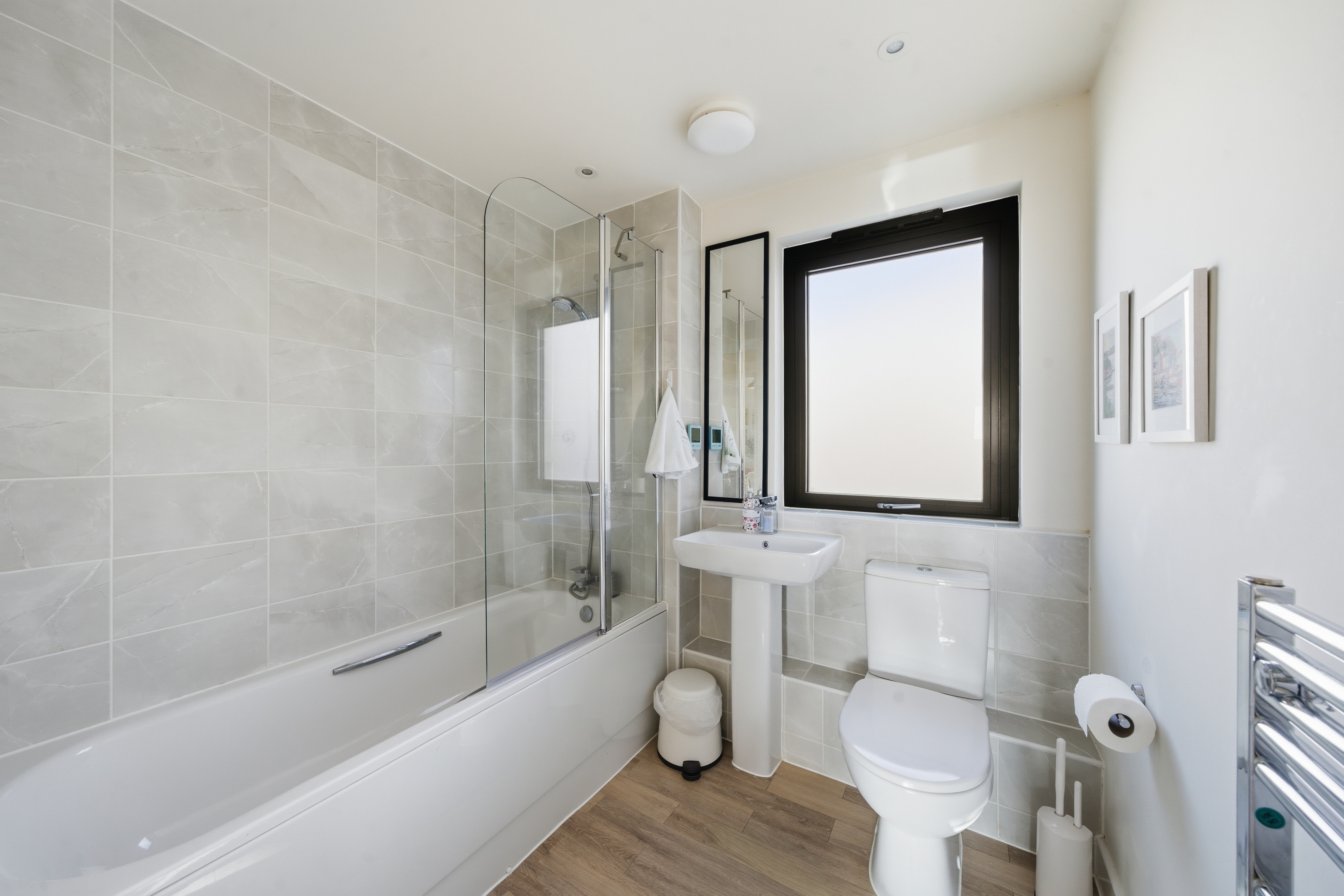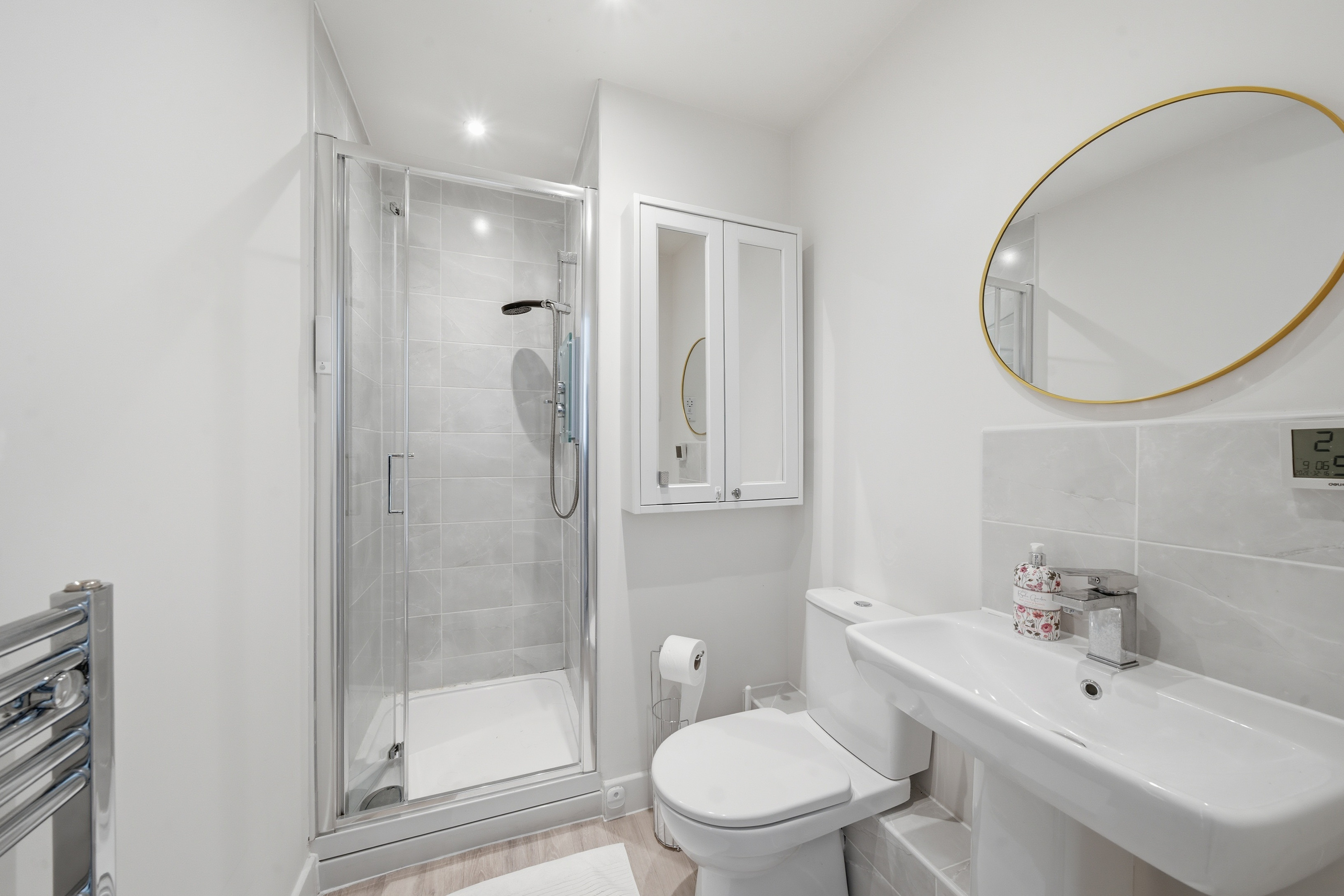 There are two well-proportioned double bedrooms. The principal bedroom benefits from its own en-suite shower room, while the second bedroom is served by a separate family bathroom. Additional storage is provided within the apartment, enhancing practicality.