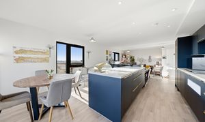 Occupying the entire top floor, the apartment is accessed via a communal entrance with stairs leading to the upper level. The heart of the home is the striking open plan living space, incorporating sitting, dining and kitchen areas. This generous room provides ample space for both relaxing and entertaining, with doors opening onto a private balcony, creating an excellent indoor-outdoor flow and allowing for plenty of natural light.
