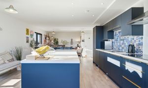 The kitchen area is fitted with a range of modern units, offering good storage and worktop space, seamlessly integrated within the open plan layout.