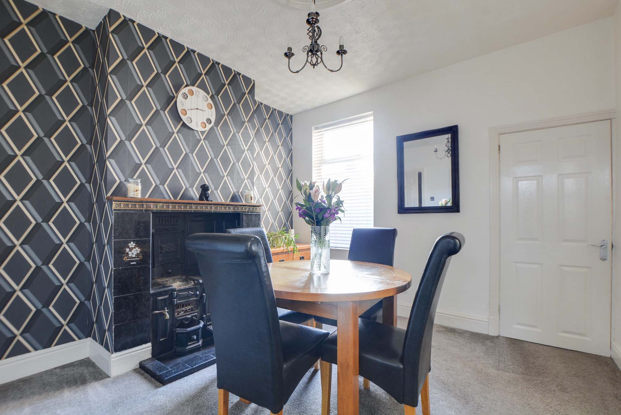 This space features double-glazed windows and a side door, bringing in plenty of natural light. It’s fitted with wall and base units topped with a work surface, along with spotlights overhead. There’s a sink and drainer with a mixer tap, plus an inset four-ring gas hob and oven with an extractor hood and splashback. You’ll also find plumbing for a washing machine, as well as room for a fridge and a freezer. Part-tiled walls and a radiator complete the room.