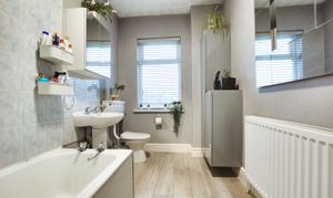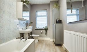 With double glazed window to the rear elevation, bath with shower over, low-level WC, wash hash hand basin, part tiled walls, built-in cupboards, airing cupboard, splash backs, radiator.