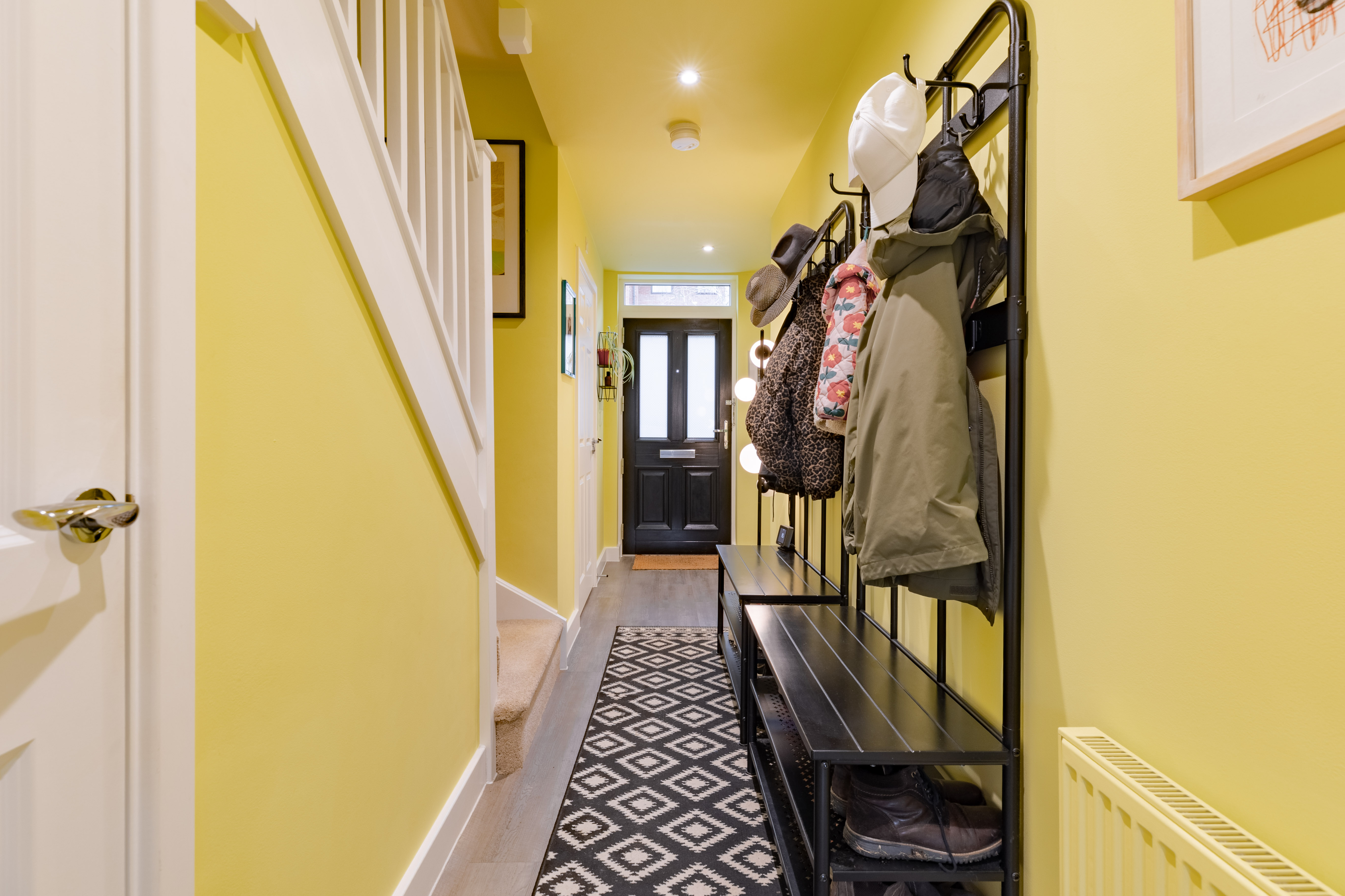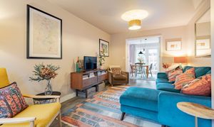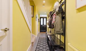 The ground floor has a welcoming hallway, leading to the main living areas. It features a spacious kitchen/dining room, designed as a sociable heart of the home with space for everyday family life and entertaining. Double doors open onto the rear garden, enhancing natural light and adding indoor-outdoor flow. To the front, a separate reception room offers a welcoming sitting space with a characterful bay window. A cloakroom completes the ground floor layout.