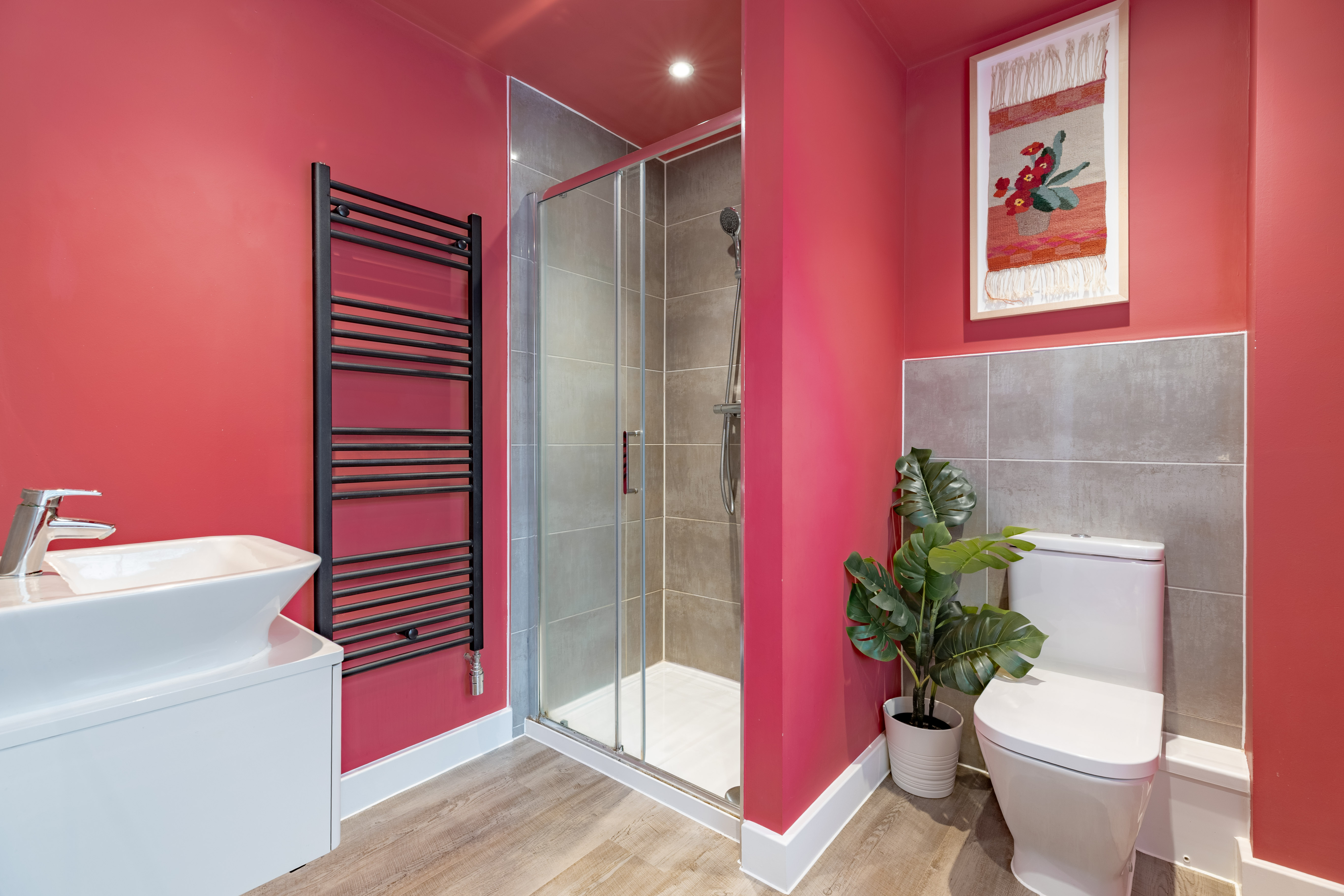 The first floor is home to two generously sized bedrooms. The principal bedroom features a bay window, walk-in wardrobe space and en-suite shower room. The second bedroom is equally spacious, overlooking the rear garden and also offering a walk-in wardrobe and en-suite shower room. Both rooms provide privacy and flexibility for family living.