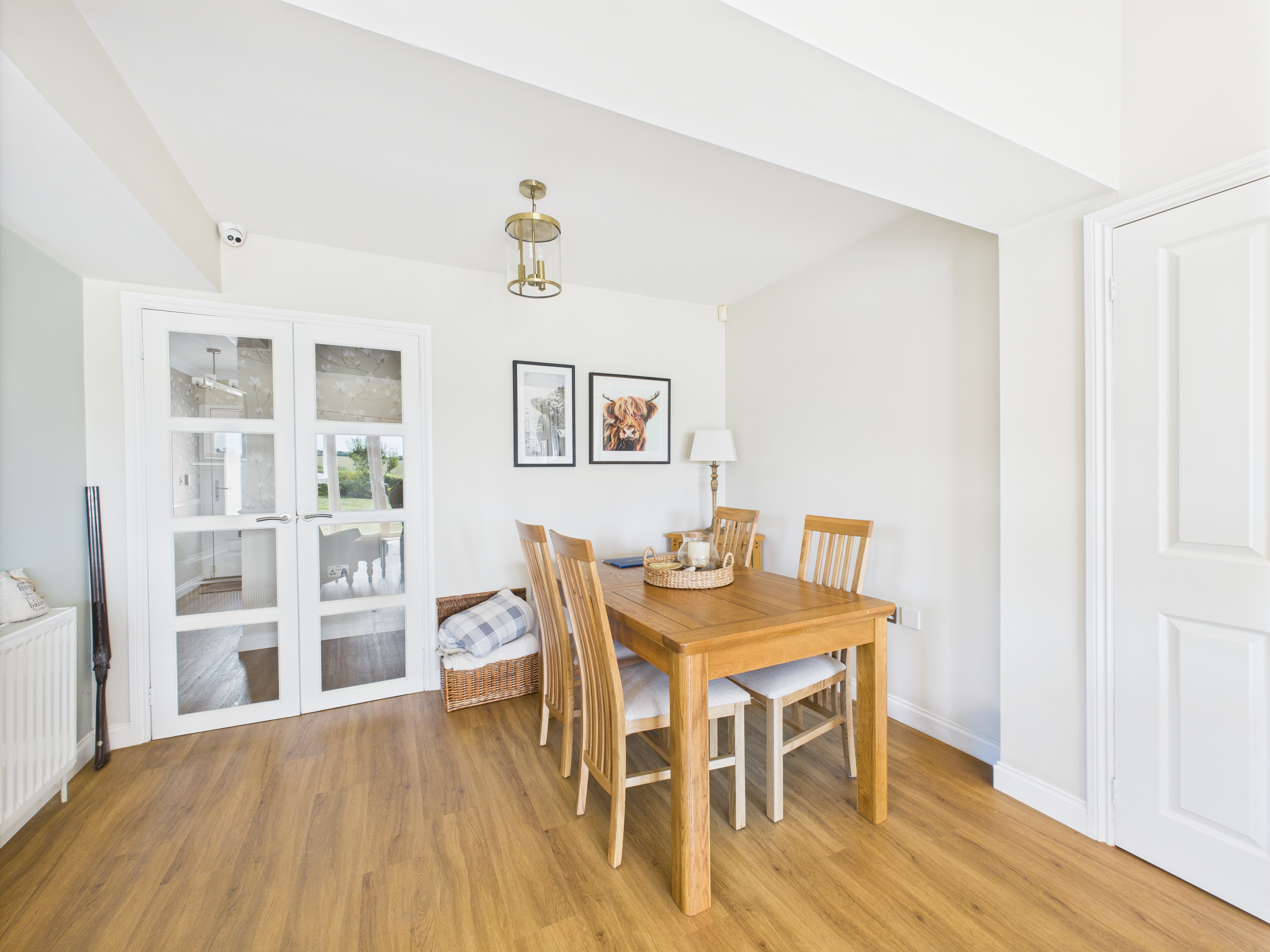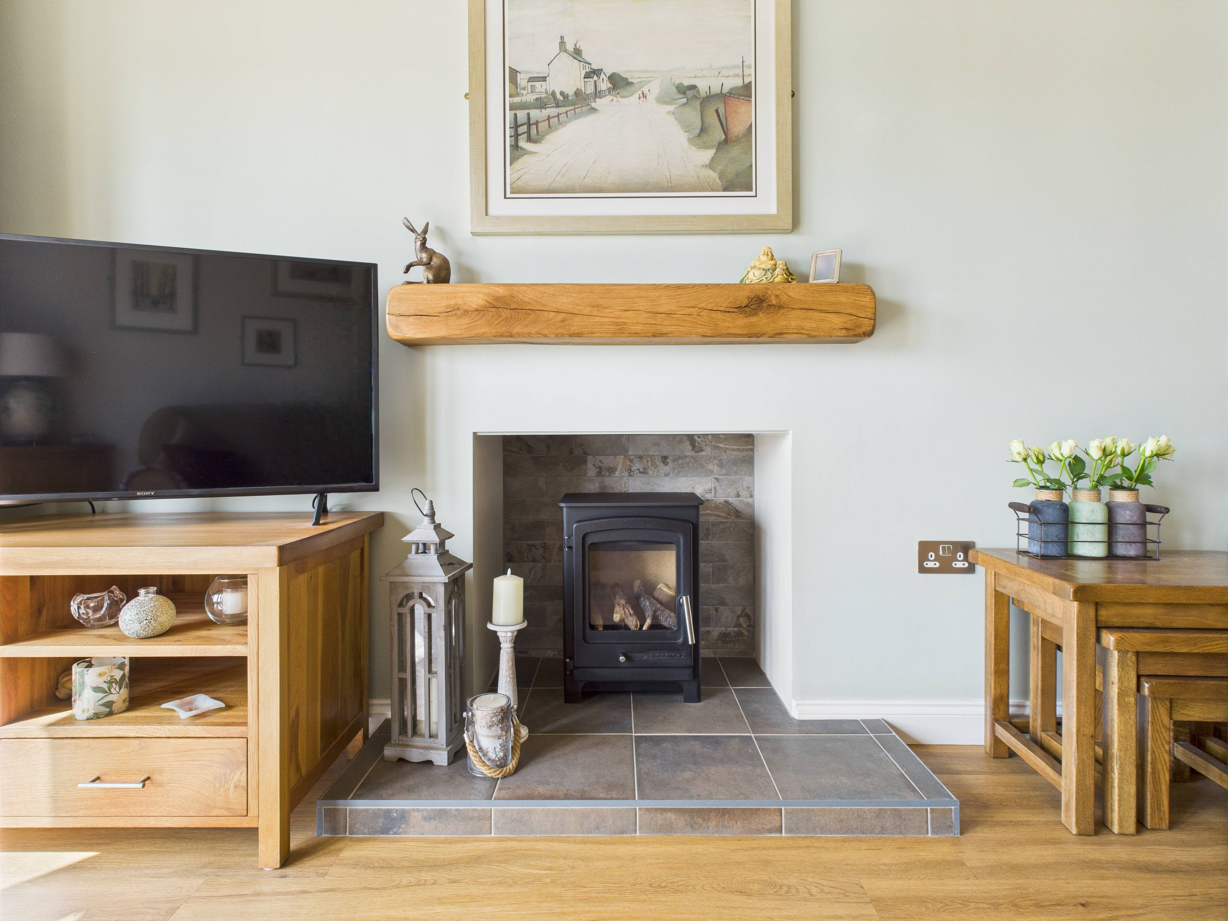 A welcoming entrance hallway with wood-effect flooring leads through double doors into the spacious lounge/dining room. This impressive room features a half-vaulted ceiling, flooding the space with natural light and enhancing the far-reaching views over the rear garden and Lambley countryside. The room also includes a feature gas stove fire with a wood mantle, tile hearth, space for dining table and chairs and wood-effect flooring.