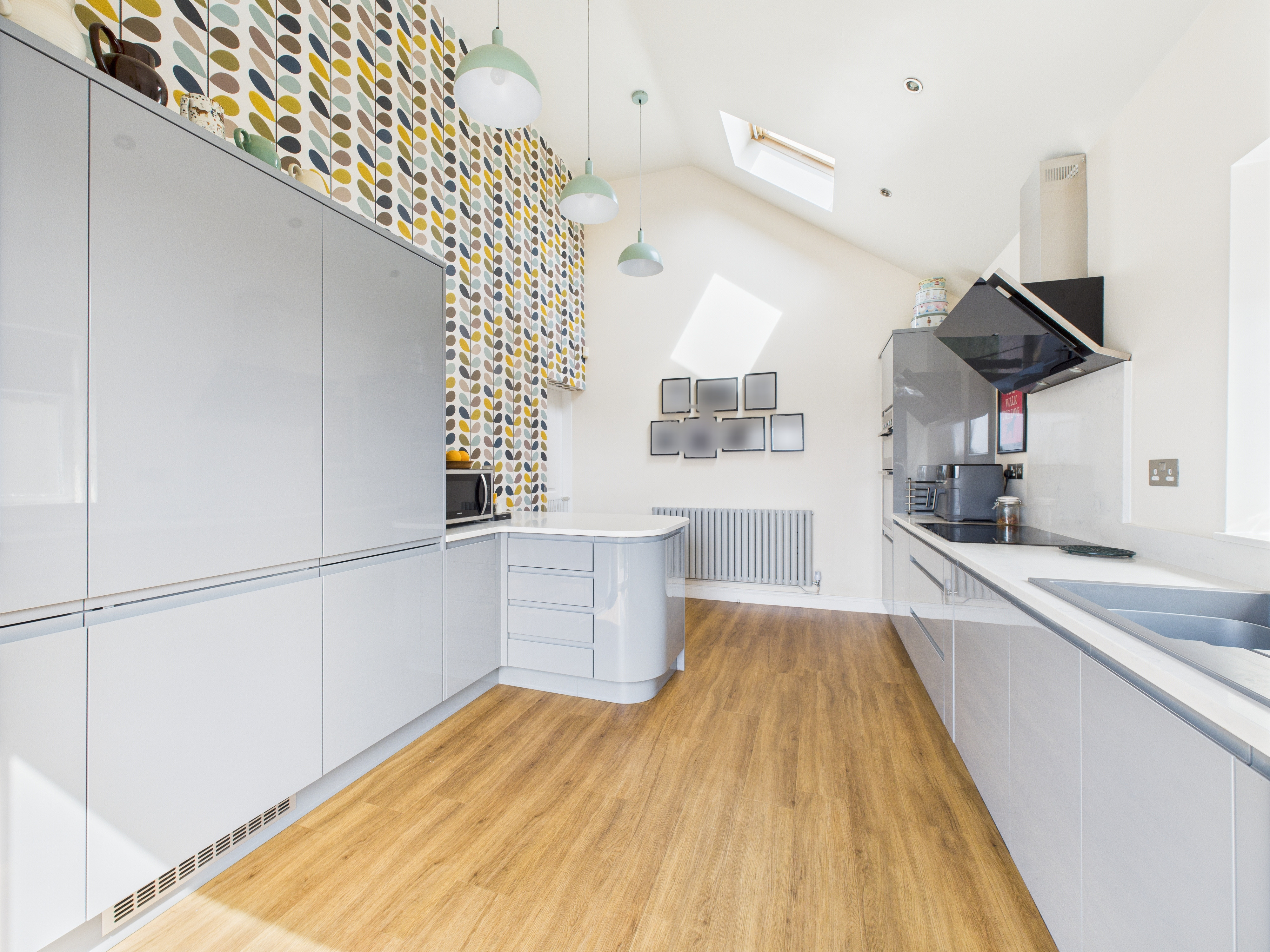 The breakfast kitchen is another highlight of this property with a half-vaulted ceiling with skylight and fitted with grey gloss units, Carrara quartz white with grey marble effect worktops and wood-effect flooring. The kitchen is well-equipped with a breakfast bar, integrated dishwasher, fridge freezer and cooking appliances. A separate utility room provides additional storage, space for freestanding appliances and access to the garage.
