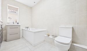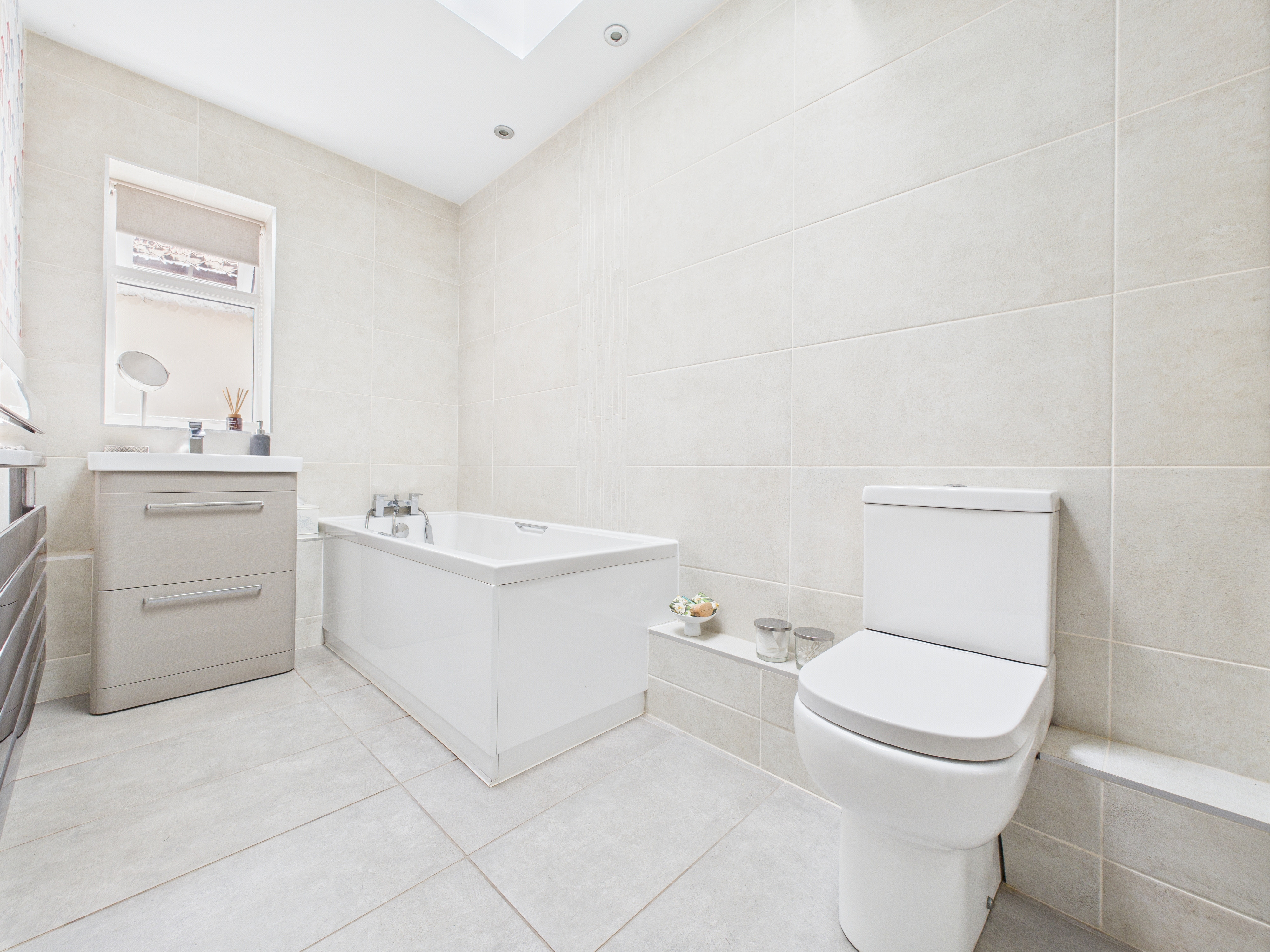 - Bright and spacious modern three-piece bathroom suite with feature skylight and vanity basin with storage