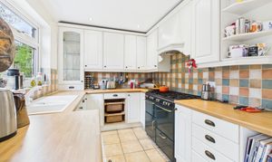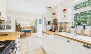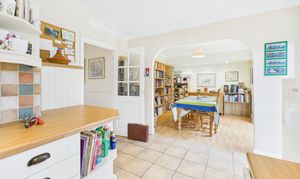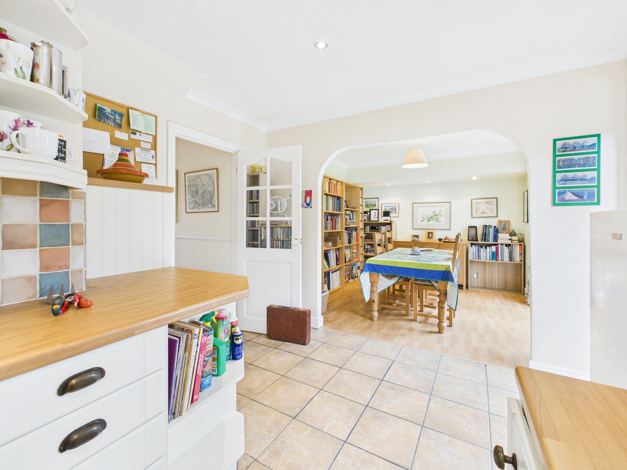 Entered under a storm canopy, the ground floor offers an entrance hall with under stairs storage, sitting room with an electric fireplace, open plan kitchen into dining room with French doors into the rear garden. The kitchen offers a further door into the garden and is fitted with a range of units and includes a range cooker with eight-ring gas hob and extractor hood, dishwasher, washing machine and a fridge freezer which are included in the sale.