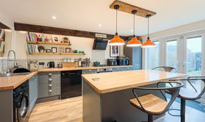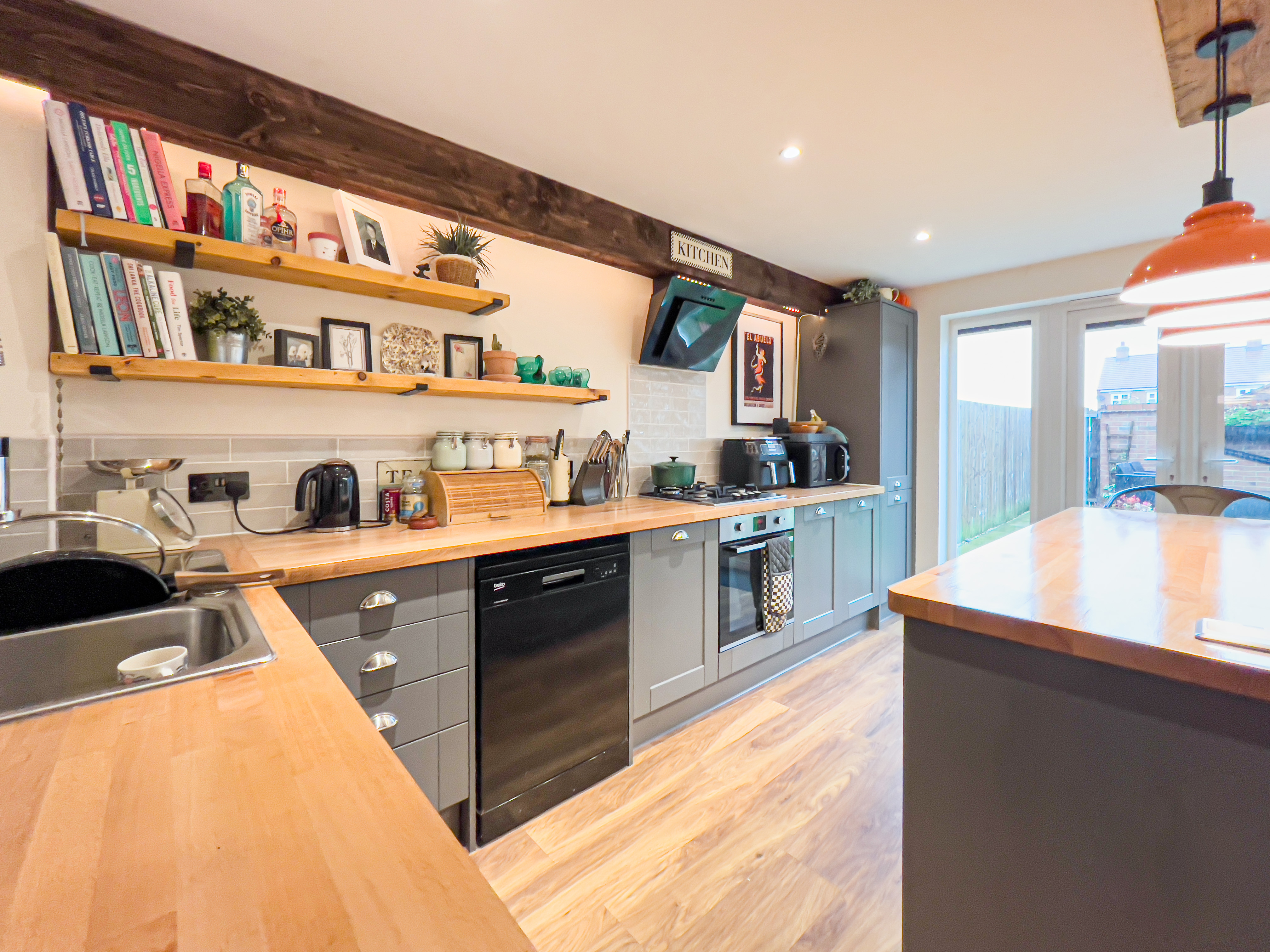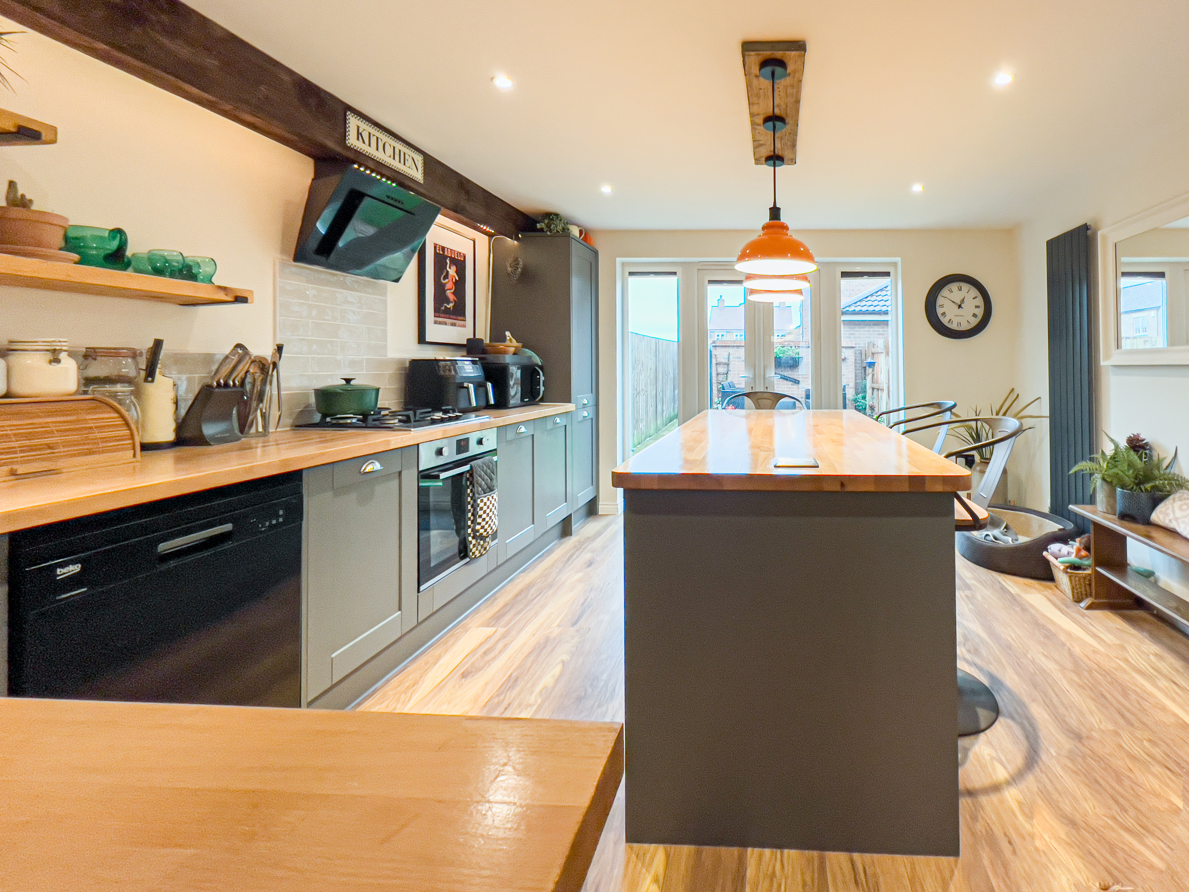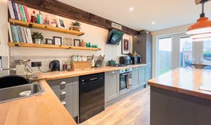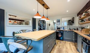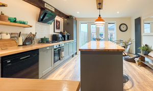 To the rear of the property the dining kitchen has double doors which open onto the garden. The kitchen is fitted with modern base and wall units including a large larder cupboard. The gas hob and electric oven are integrated. The large island offers seating with overhead downlighters.