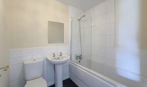 The house bathroom is fitted with a bath with a overhead shower, toilet and basin.