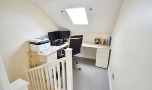 Skylight to front, smooth plastered ceiling with down lighters, bespoke study area and door leading to