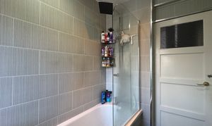 - Modern bathroom with mains powered shower over bath and heated towel rail