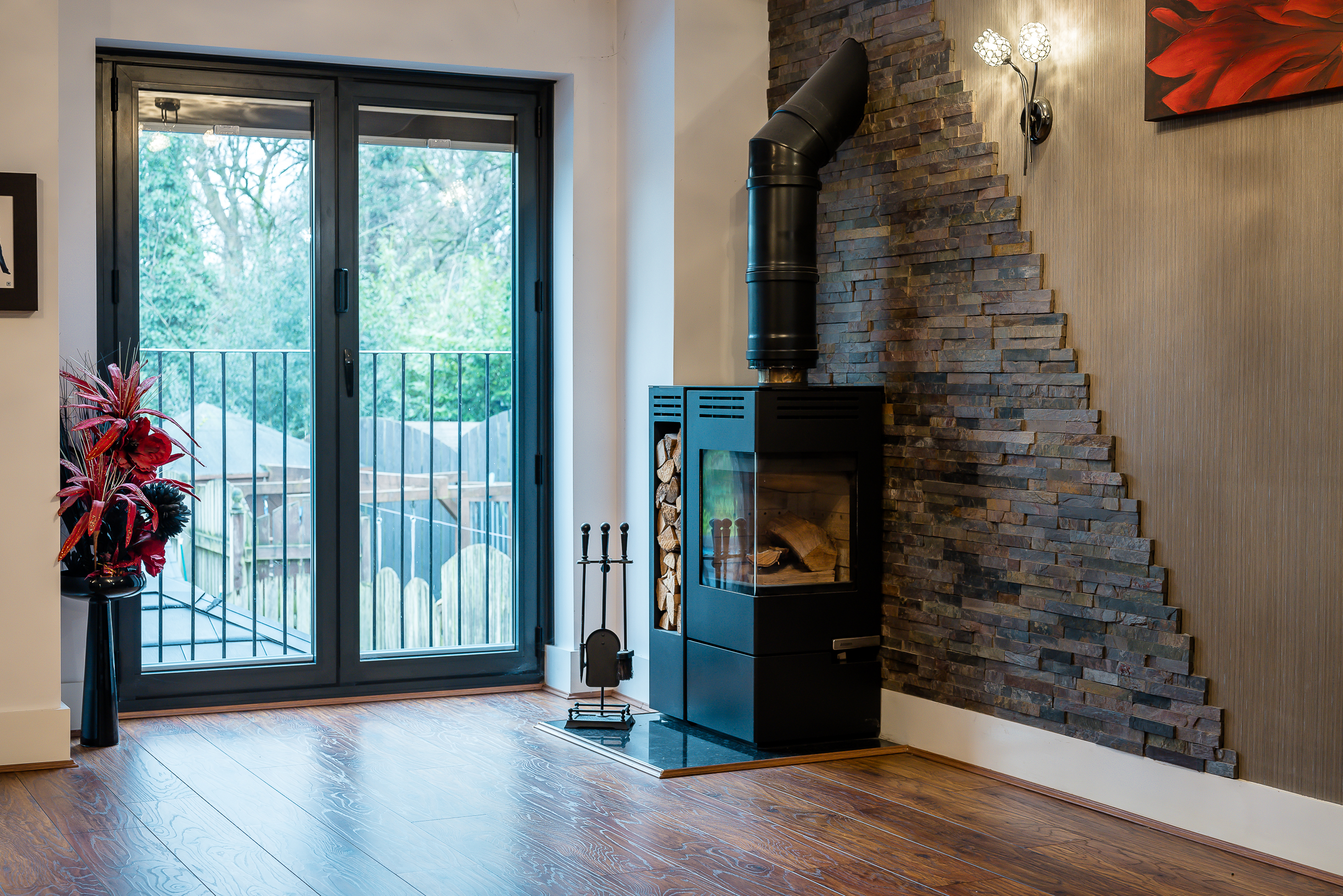 Carpeted stairs lead to the first floor landing allowing access to a rear elevation living room, boasting a Juliette balcony overlooking the mature garden and Worsley Golf Course. There is also a fabulous log burning stove . There is also a stylish, contemporary family bathroom and two bedrooms, one boasting convenient fitted wardrobes.