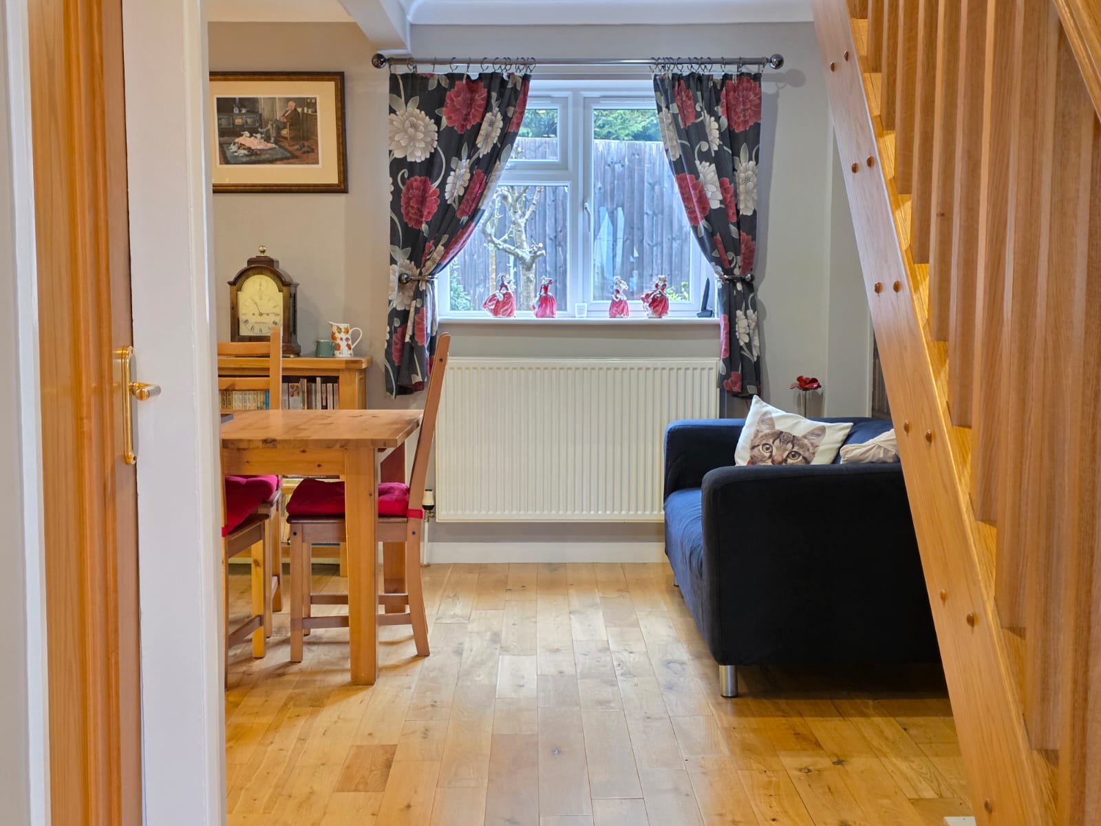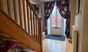 The initial hallway includes oak flooring, radiator, coving to ceiling and exposed wooden staircase.