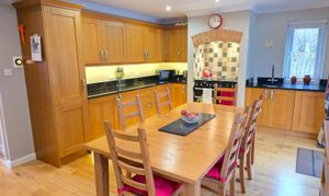 The open plan kitchen/diner includes the continuous oak flooring, spotlighting, coving to ceiling, space for a large 6 seater table, NEST thermostat, TV connectivity and access through into the conservatory. The kitchen has a range of wall and base units with rollover work top, integrated sink and mixer tap, space for a range cooker with extractor and light above, under-unit lighting and integrated fridge & freezer.