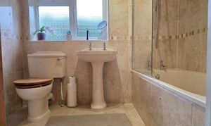 The family bathroom has tiled panel bath with shower over, wash hand basin, low level flush WC, chrome heated towel rail, tiled flooring, tiled walls and obscure UPVC double glazed window.