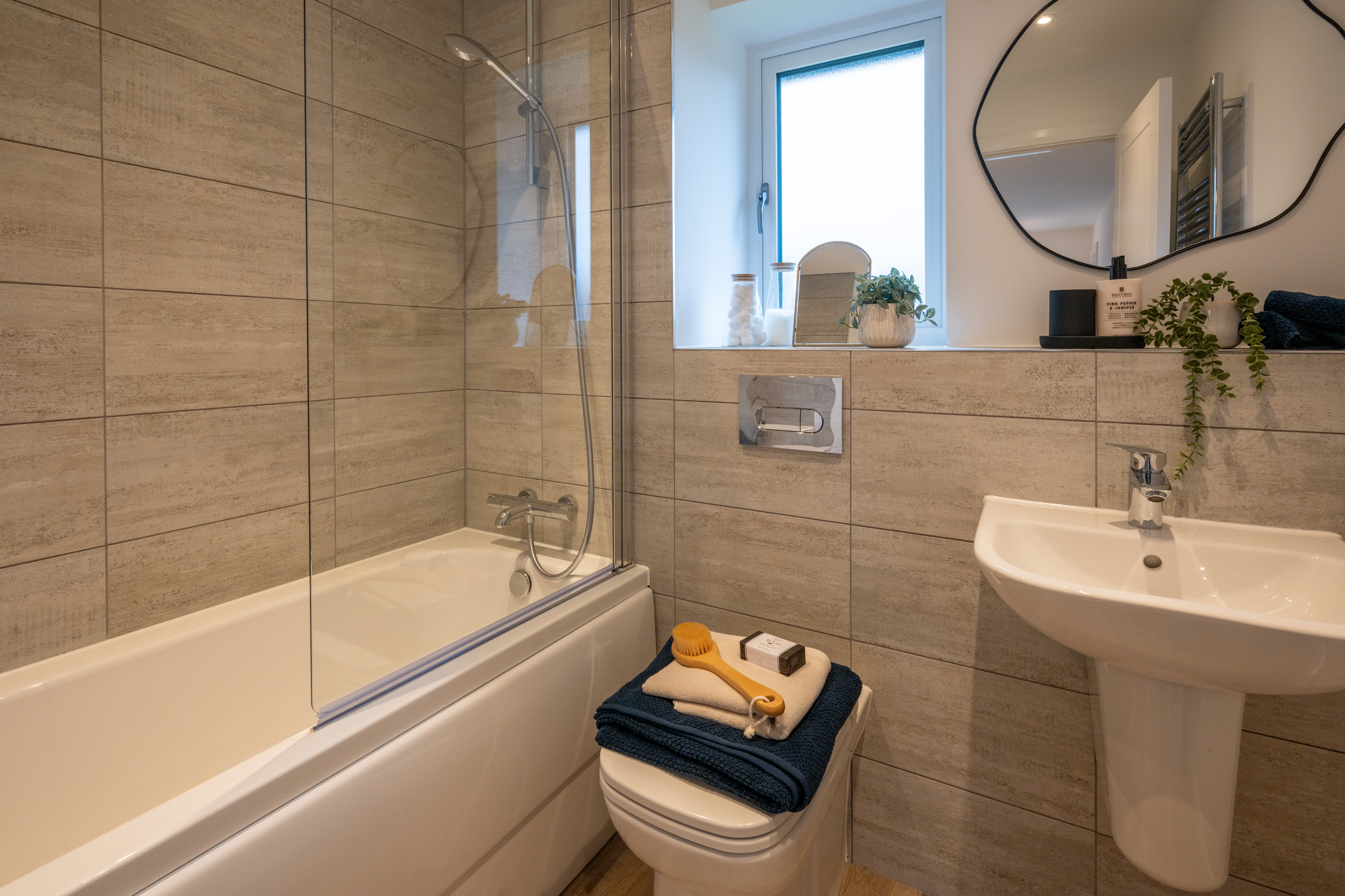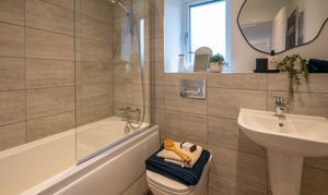 Upstairs you’ll find four good-sized bedrooms, with the master bedroom featuring a large fitted wardrobe and ensuite. The family bathroom comes with white Vitra sanitaryware, Hansgrohe shower over bath and Porcelanosa tiling.