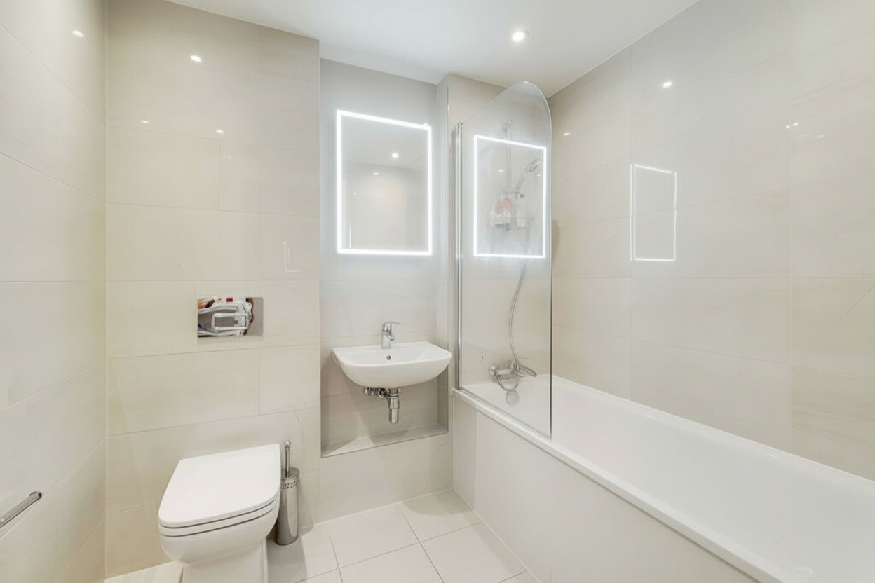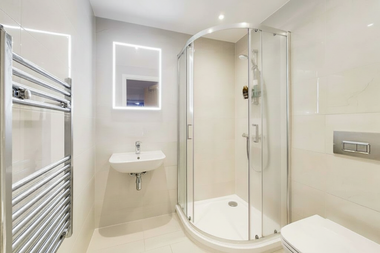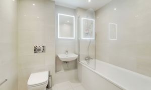 Both bedrooms are generously sized doubles and benefit from built in wardrobes. The main bedroom enjoys a sleek ensuite shower room, while a contemporary family bathroom serves the second bedroom and guests. Additional comfort features include underfloor heating throughout the apartment.