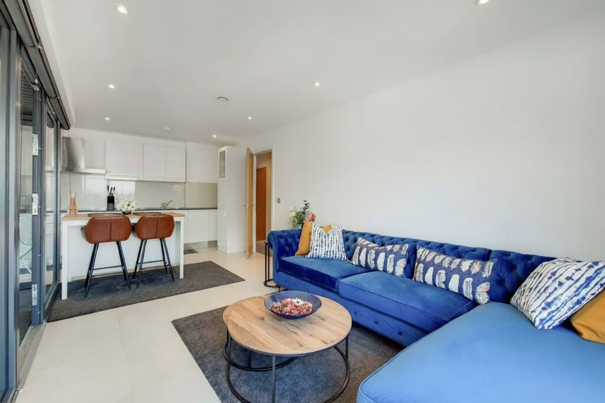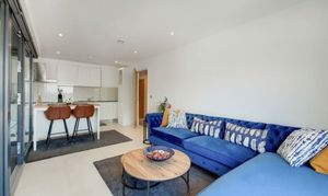 The spacious open plan reception room is a standout feature, boasting floor to ceiling windows that flood the space with natural light. It opens onto a stylish and fully fitted kitchen complete with integrated appliances and a breakfast bar, creating the perfect setting for cooking, dining and entertaining. From the reception, doors lead out to a private balcony with space for outdoor seating, providing a relaxing spot to unwind.