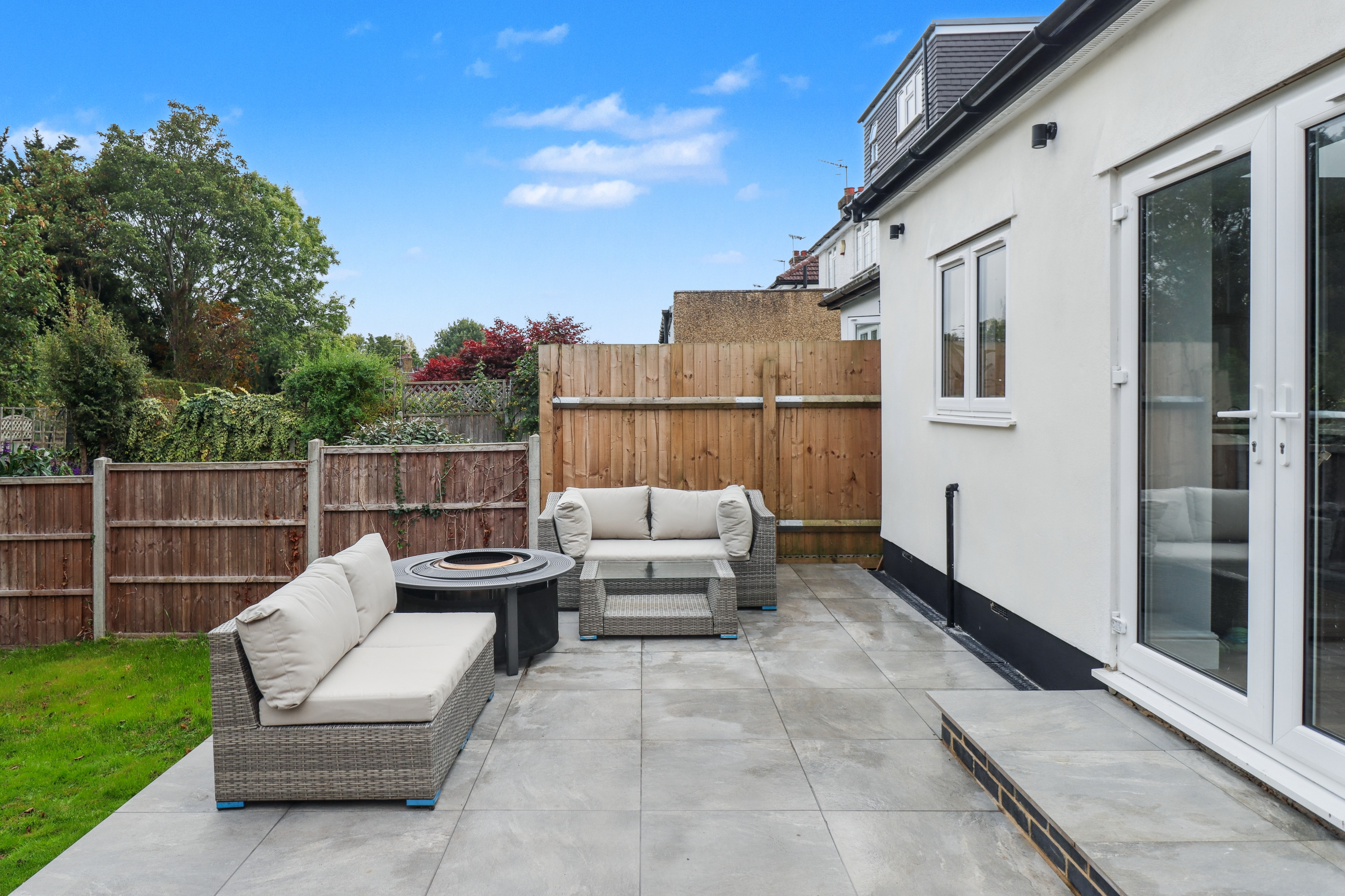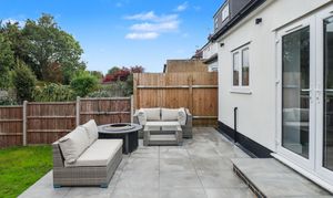 Outside, the north-easterly garden provides a tranquil private oasis. A generous paved terrace extends directly from the kitchen (perfect for alfresco dining or evening drinks) leading down to a lush lawn ideal for children, pets, or simply relaxing in the sun. To the side, the garage offers exceptional flexibility, whether used for storage, a gym or a creative workspace.