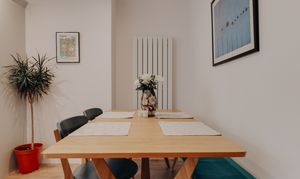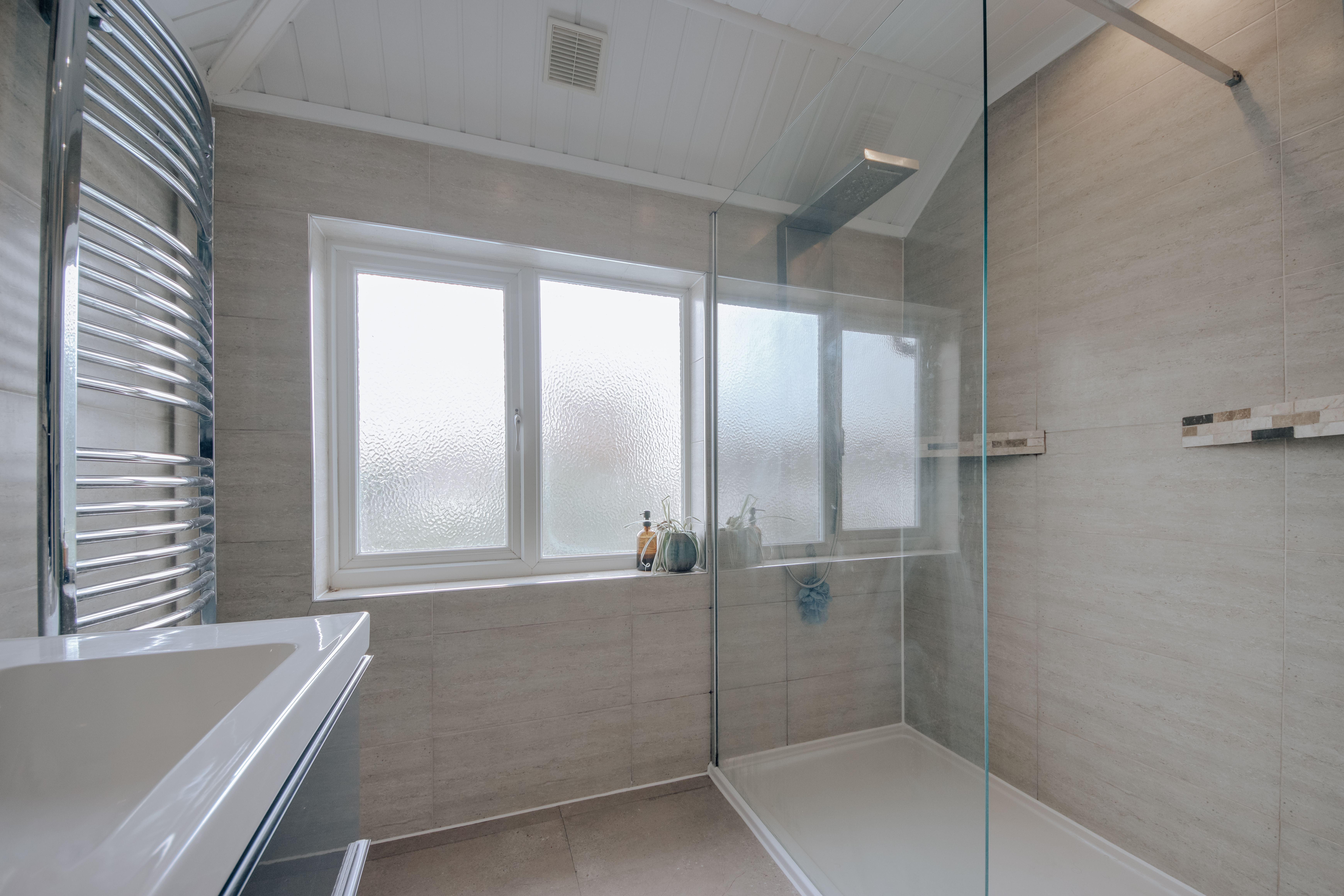 Upstairs, three well-proportioned bedrooms continue the home’s refined aesthetic. The principal bedroom (11’10” x 9’10”) is a calm and uplifting retreat, featuring bespoke fitted wardrobes and an east-facing aspect that welcomes soft morning light. Two further bedrooms offer versatility for family, guests, or home working, each finished with the same attention to detail. The family bathroom is luxurious and serene, showcasing a large walk-in shower, elegant tiling, and contemporary fixtures that complete the home’s cohesive design story.