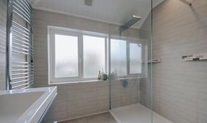 - Luxury family bathroom with walk-in shower and modern finishes.