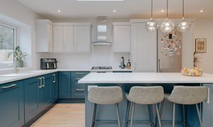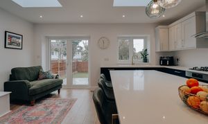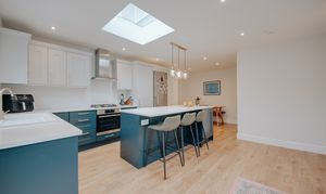 Step inside to a broad and inviting hallway that introduces the home’s carefully layered interiors. To the right lies the formal living room; measuring a generous 13’7” x 12’2”, where a feature fireplace, bay window, and refined navy-and-white palette set an elegant tone. Thoughtfully proportioned and versatile, it’s a space equally suited for quiet evenings or hosting guests. To the rear, the kitchen/breakfast room forms the true heart of the home (part of a beautifully executed extension) that floods the space with natural light from skylights and wide double doors opening onto the garden. A striking central island anchors the room, surrounded by sleek cabinetry, extended worktops, and premium integrated appliances. Contemporary yet timeless, it’s a space designed for both relaxed family living and sophisticated entertaining. A discreet utility cupboard and ground-floor cloakroom add everyday convenience without compromising style.