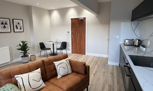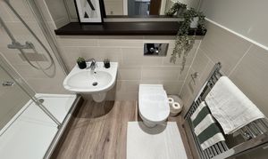Finished to a high standard throughout, the apartment includes a brand-new tan sofa, a bistro dining set, and a spacious bedroom complete with a double bed, desk, and generous storage. The sleek kitchen features integrated appliances, while the contemporary shower room includes a shower cubicle, toilet, hand basin and a heated towel rail. A wall-mounted Smart TV and high-speed Wi-Fi add convenience and comfort, making the property an ideal choice for both students and professionals. Its prime position also places you within easy reach of both Sheffield Hallam University and the University of Sheffield.