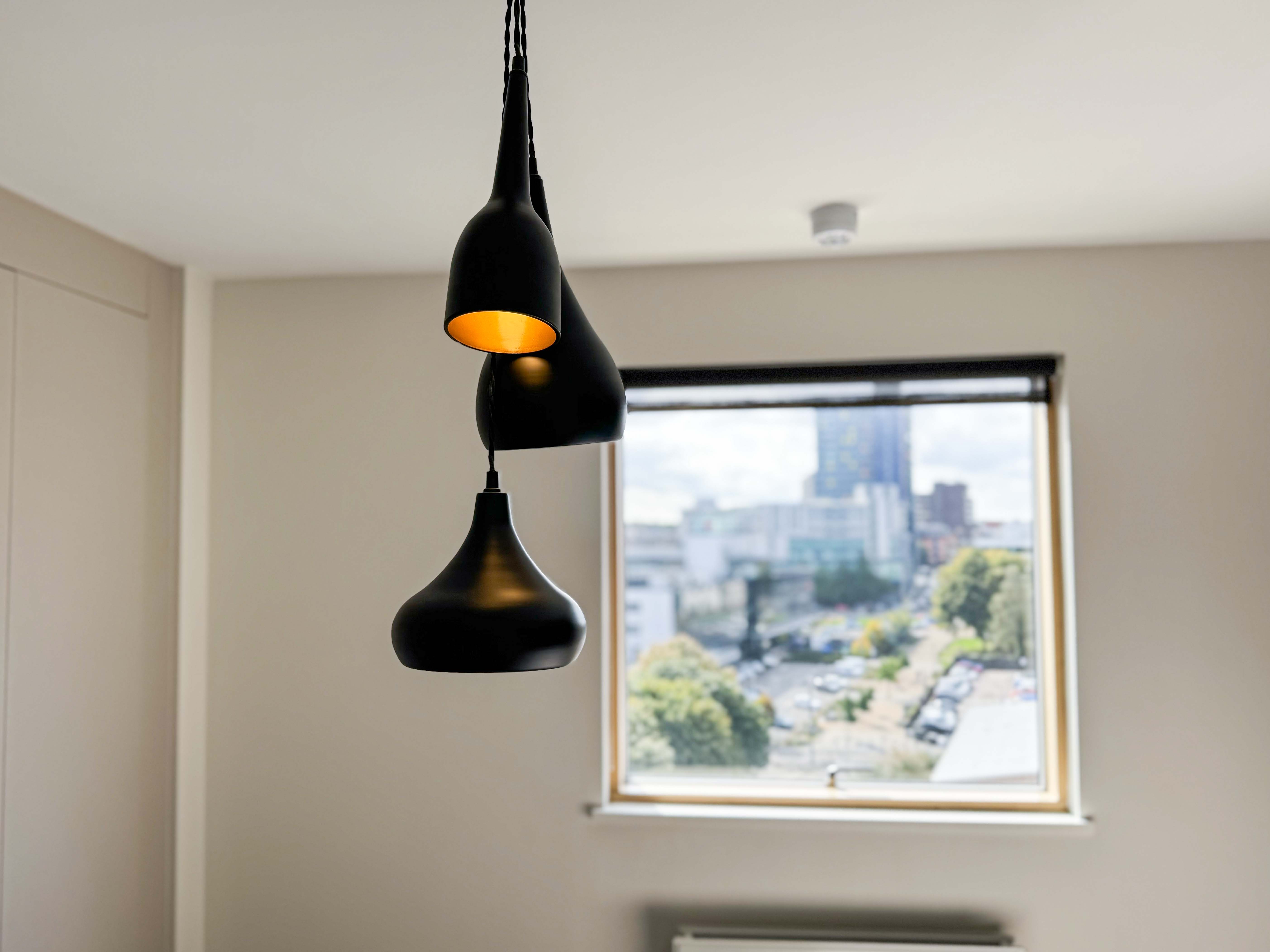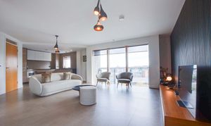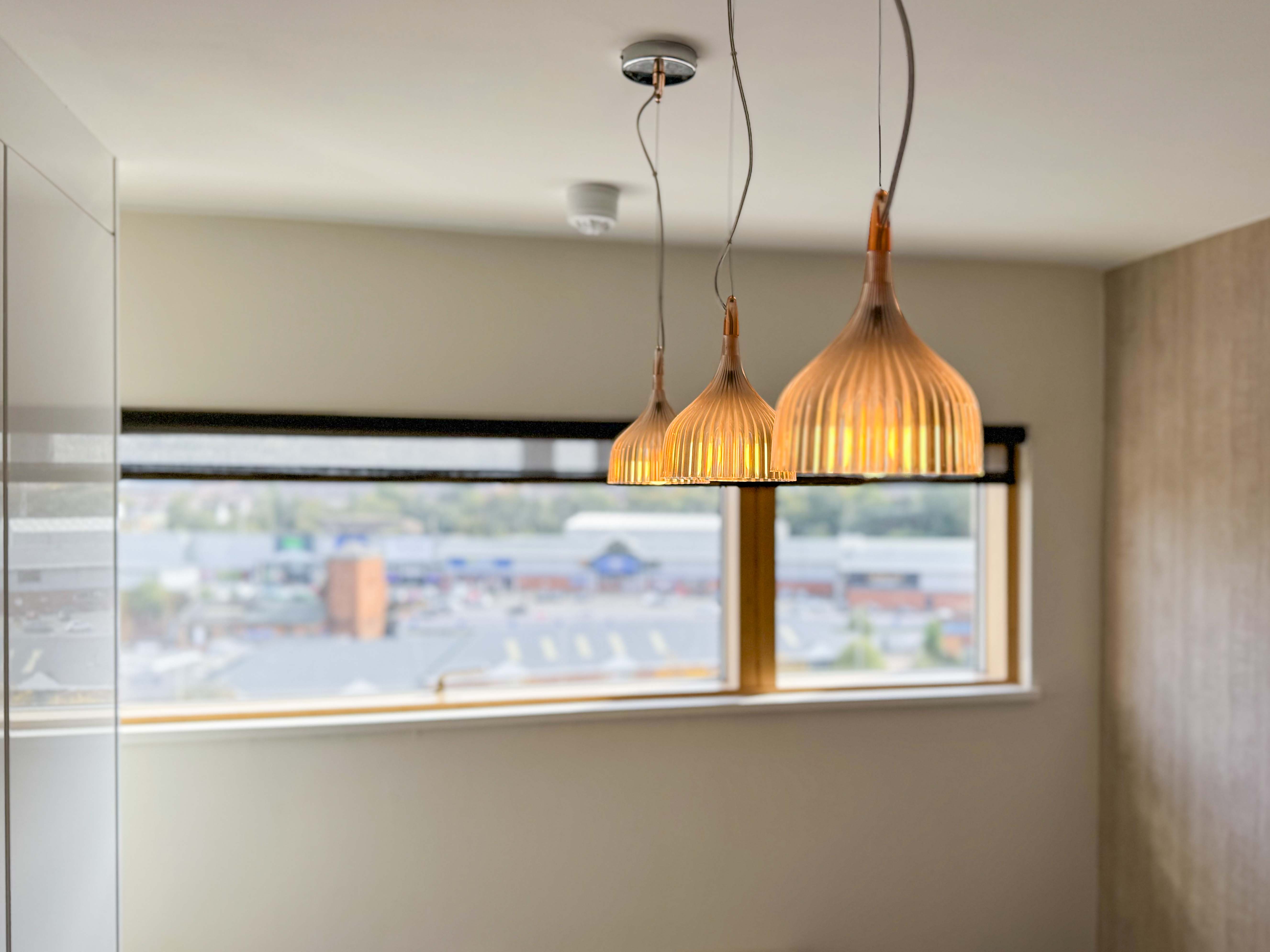 With Velfac double glazed windows and doors providing views over Leicester City centre, access to a balcony, leather effect tiled floor, TV point, feature drop down lighting, Acupanel feature walls, wall mounted radiator, open aspect to the kitchen area.