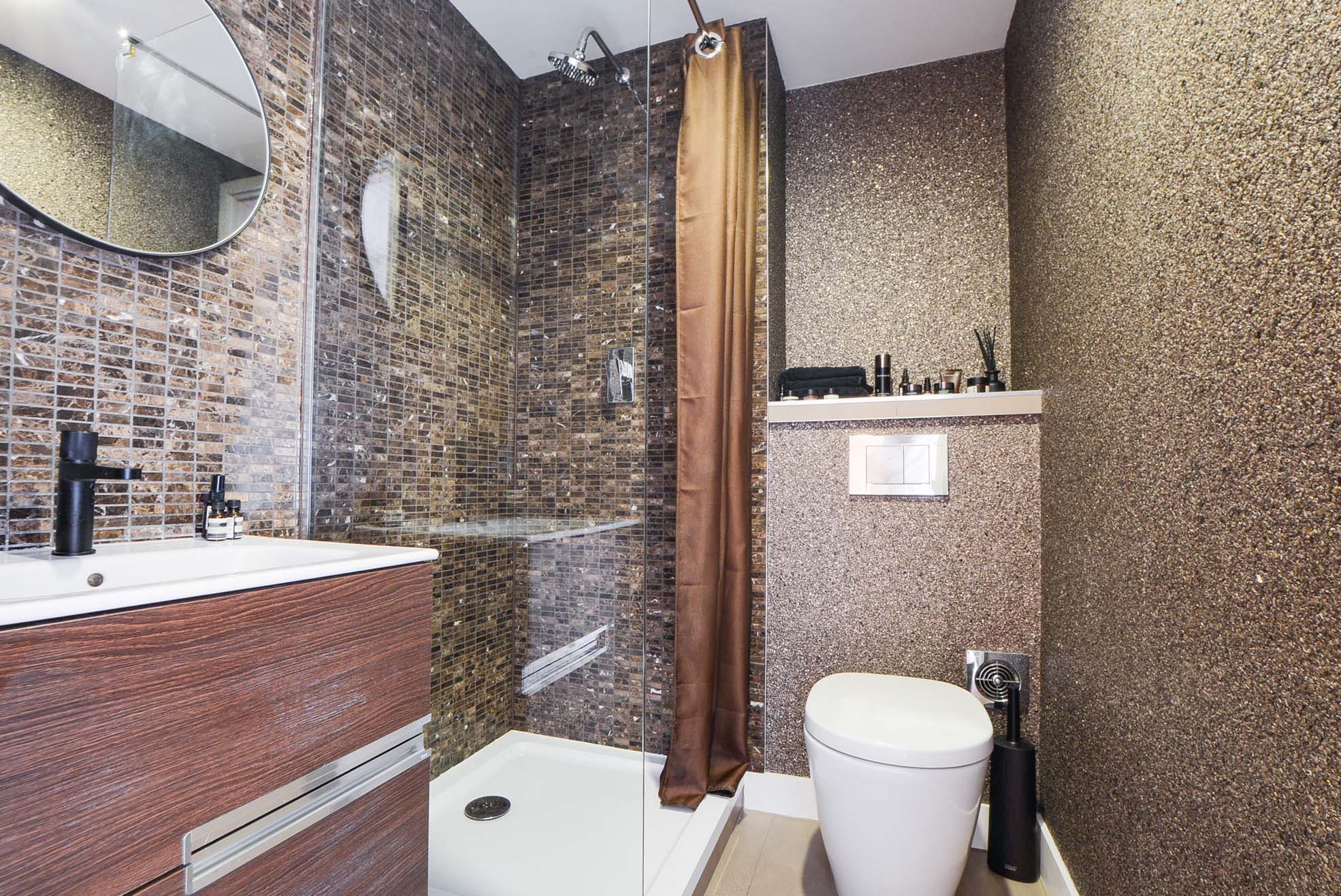 A stylish en-suite shower room with a Roca suite with leather effect tiled floor, shower cubicle, vanity wash hand basin, low-level WC, extractor fan, part tiled walls.