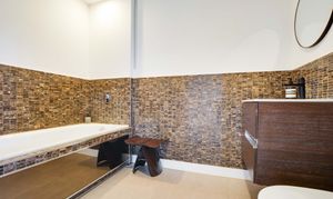With leather effect tiled floor, part tiled walls, Roca suite including bath, low-level WC, vanity wash hand basin, extractor fan.