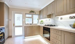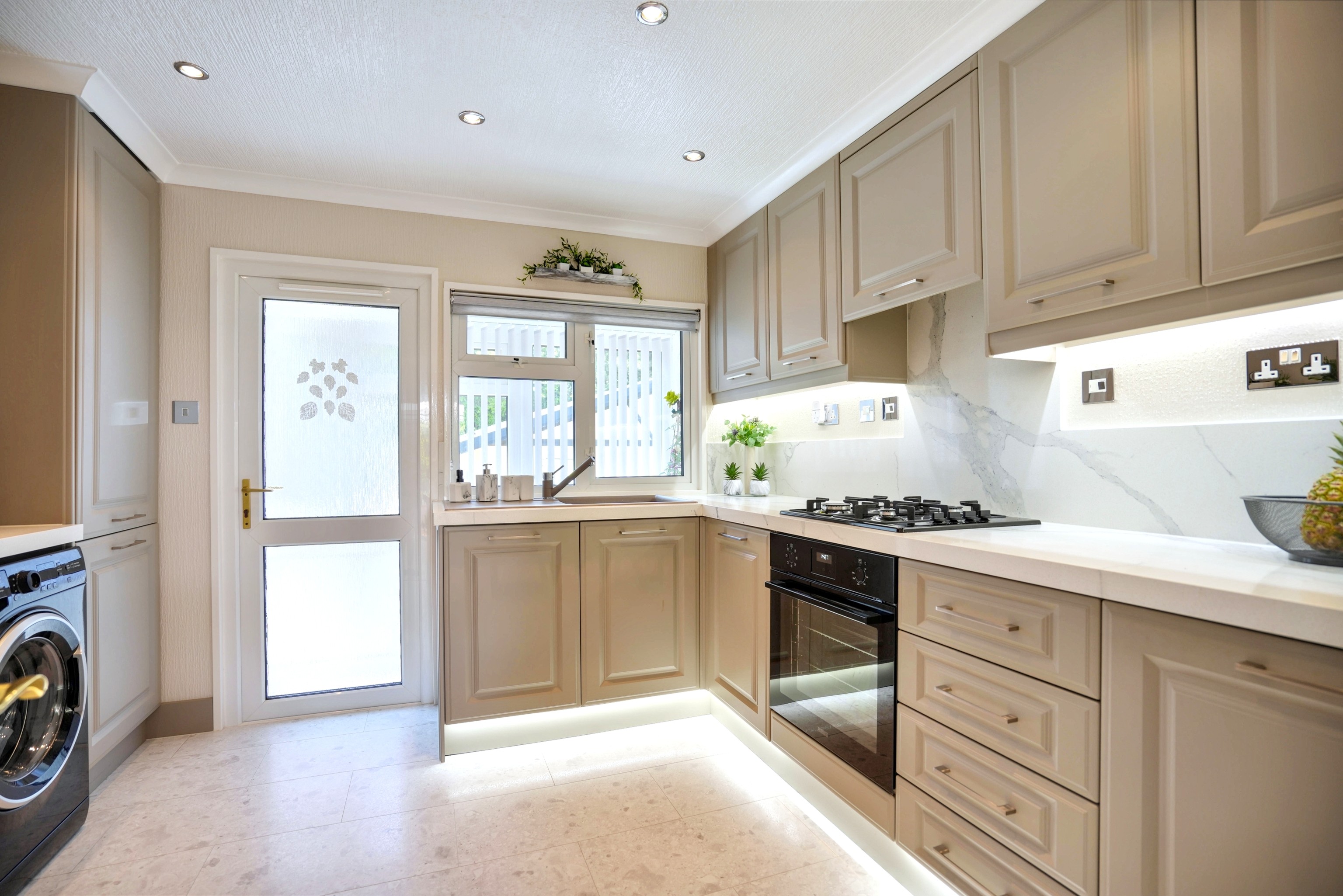 Inside, the property features a bright, open-plan layout with a well-proportioned lounge/dining area and an immaculate fitted kitchen with modern appliances and ample storage. The accommodation includes two double bedrooms, the master with its own en-suite shower room, and a further well-appointed bathroom.