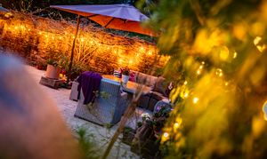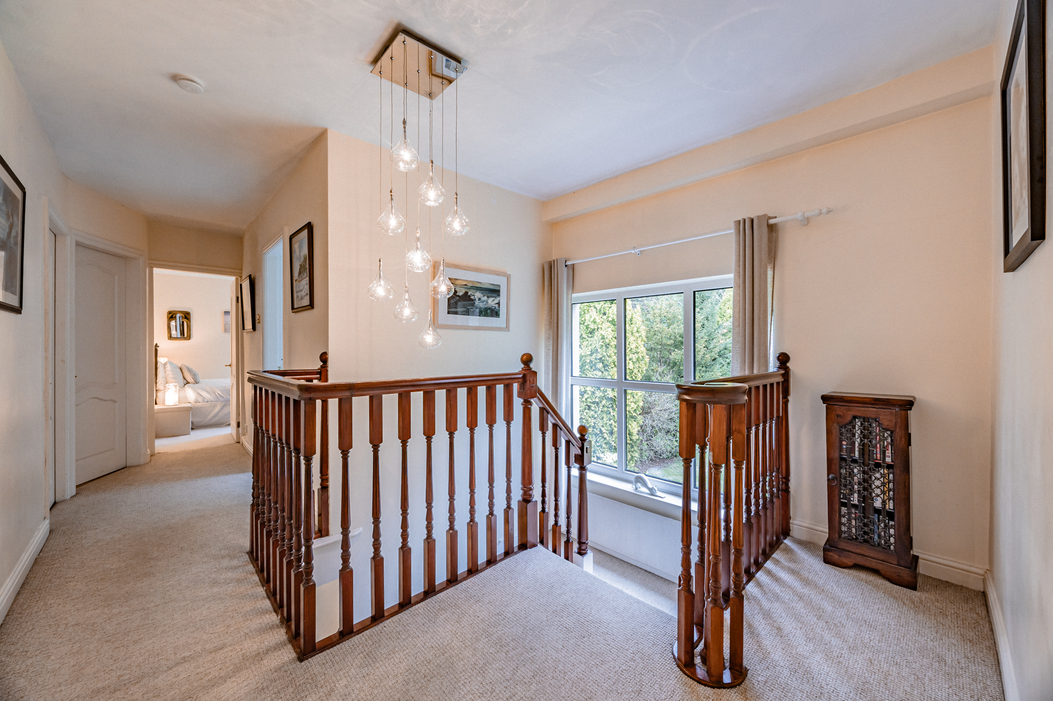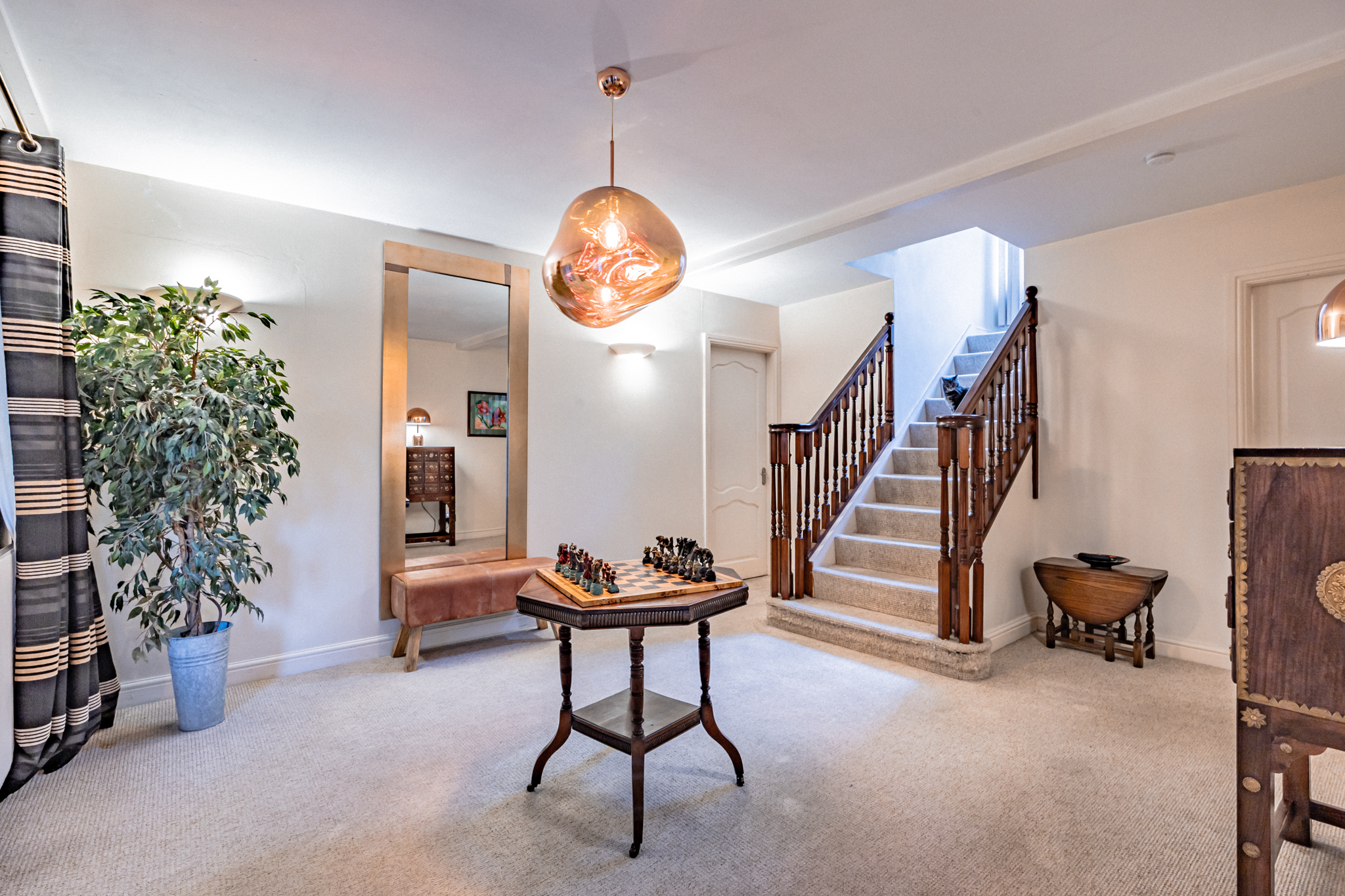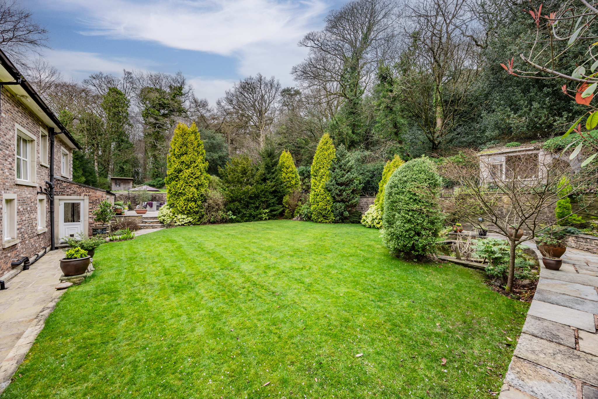 Thoughtfully designed pathways, softly lit for evening use, wind through the gardens, leading from a rose and clematis-covered pergola to a tranquil seating area that captures the last of the evening sun. A generous terraced area adjoining the house forms a sheltered suntrap, ideal for entertaining or relaxing throughout the seasons. The upper garden, currently used as a football pitch, offers excellent potential for further landscaping, whether as formal gardens, a vegetable plot, or even the addition of a swimming pool. Despite their scale, the gardens are easily maintained, with the current owners employing a gardener for just an hour a week.