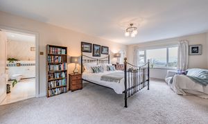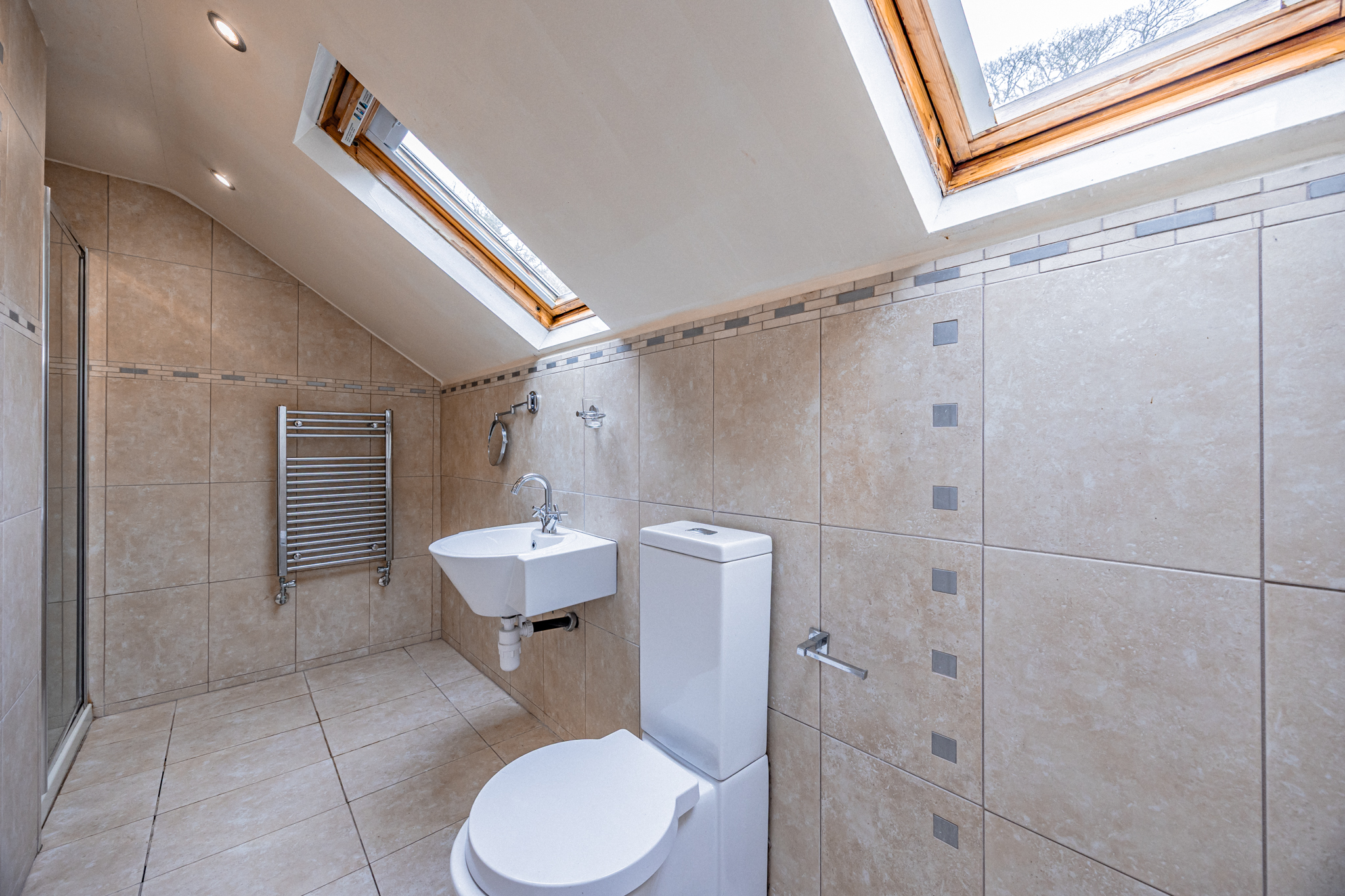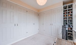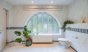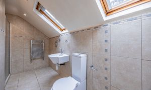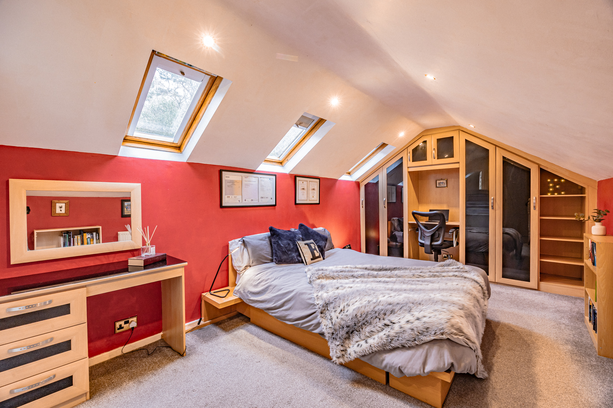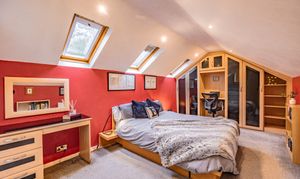 Upstairs, a spacious landing leads to four well-proportioned bedrooms. The principal suite is especially notable, benefitting from dual-aspect views, a large dressing room with fitted wardrobes, and an expansive ensuite bathroom complete with bath, separate shower, twin sinks and a feature arched window. A second bedroom also enjoys ensuite facilities, while two further double bedrooms are served by a stylish family bathroom with jacuzzi bath and shower. The top floor hosts a generous fifth bedroom with Velux windows, fitted storage and its own ensuite, providing a private and versatile retreat.