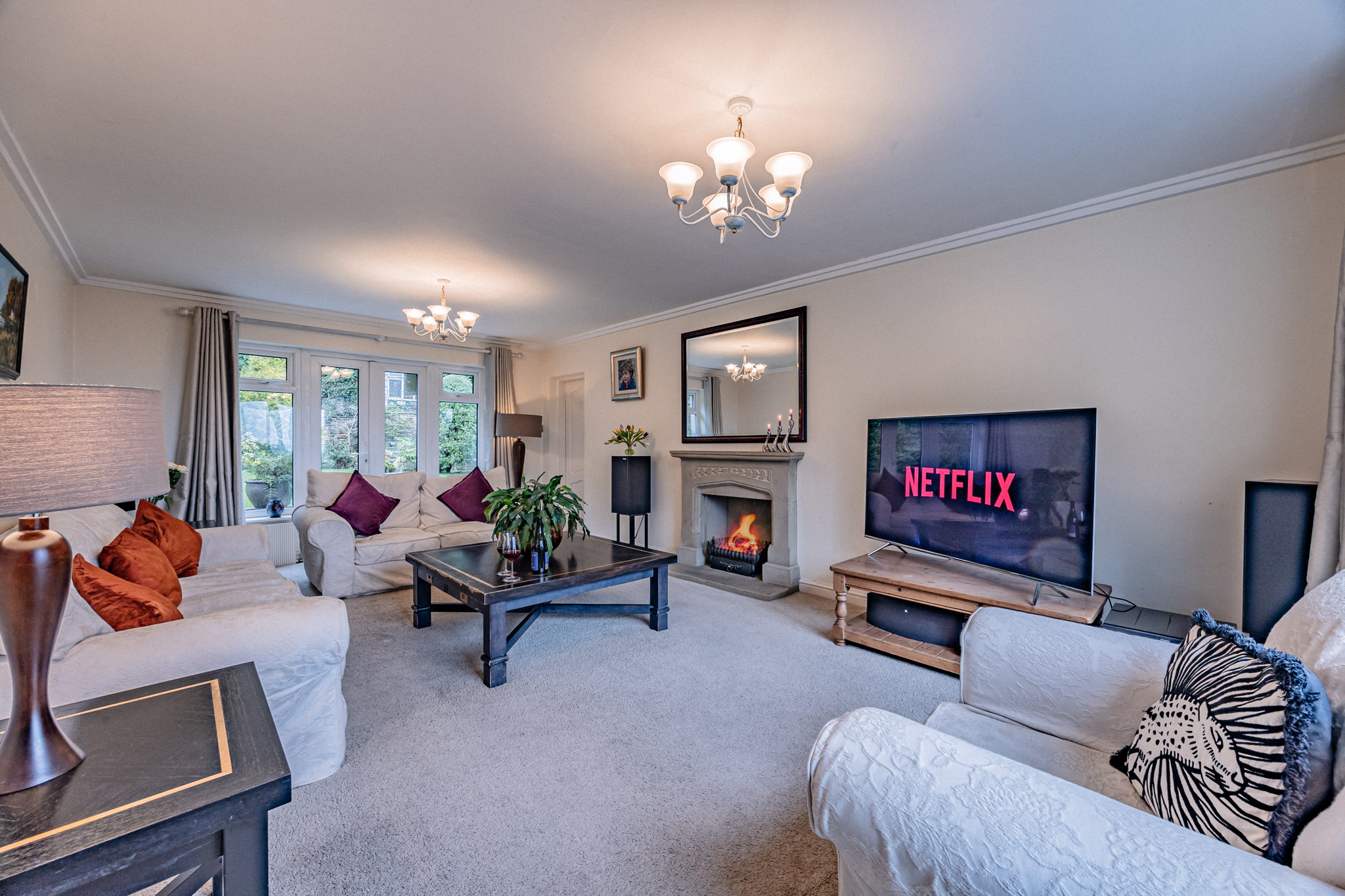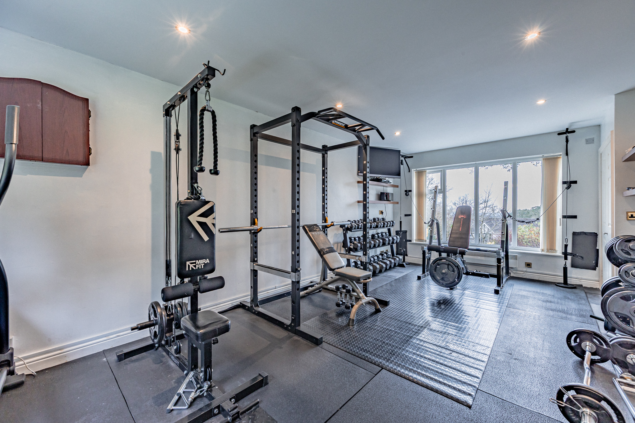 The adjoining dining room is an exceptional space for entertaining, with windows on three sides and views across the terrace, enhanced by underfloor heating for added comfort. A separate front-facing reception room provides a cosy and intimate sitting room, complete with gas fire and peaceful west-facing views. The principal reception room is particularly impressive, enjoying dual aspects to both the front and rear, and featuring French doors that open onto the garden, along with a striking limestone fireplace. A further versatile reception room, currently used as a gym but previously serving as a ground floor bedroom (bedroom 6), offers flexible accommodation suitable for a variety of needs, including a home office, playroom or additional bedroom.