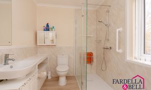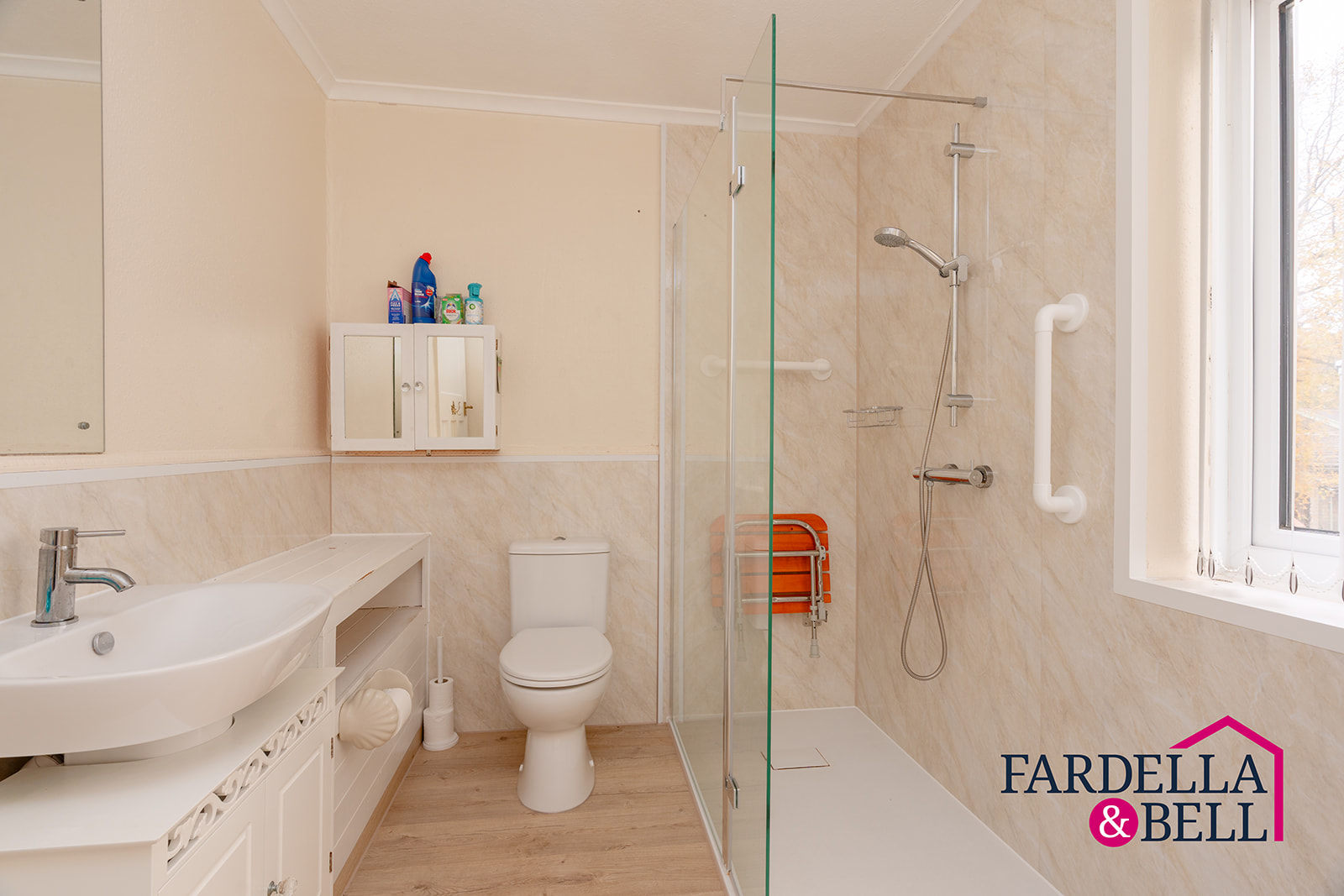 Walk in shower with mains fed shower, frosted uPVC double glazed window, push button WC, vanity unit with sink and chrome mixer tap, laminate flooring and ceiling light point.