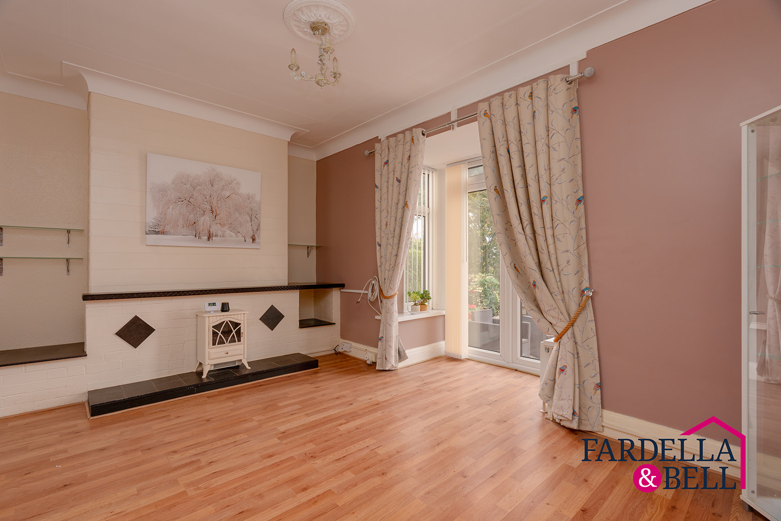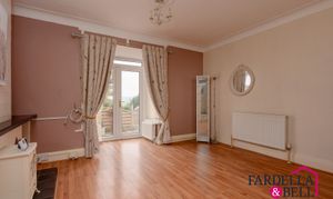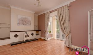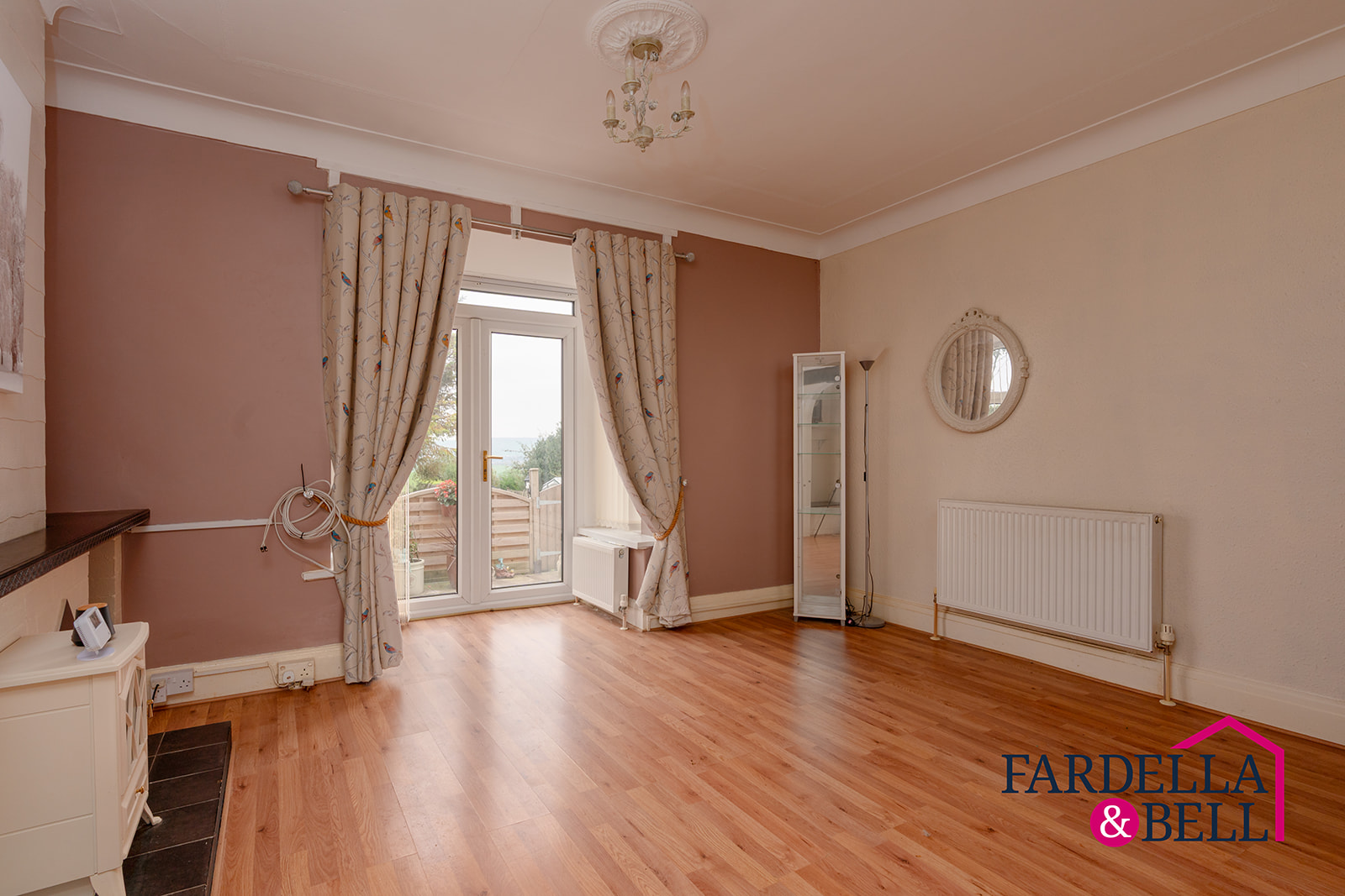 Laminate flooring, ceiling coving, ceiling light point, two radiators and uPVC double glazed patio doors leading to the rear garden.