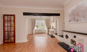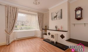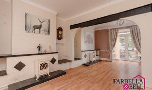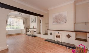 Open plan room leading into dining space - Laminate flooring, two radiators, ceiling coving, uPVC double glazed window, storage heater and ceiling light point.