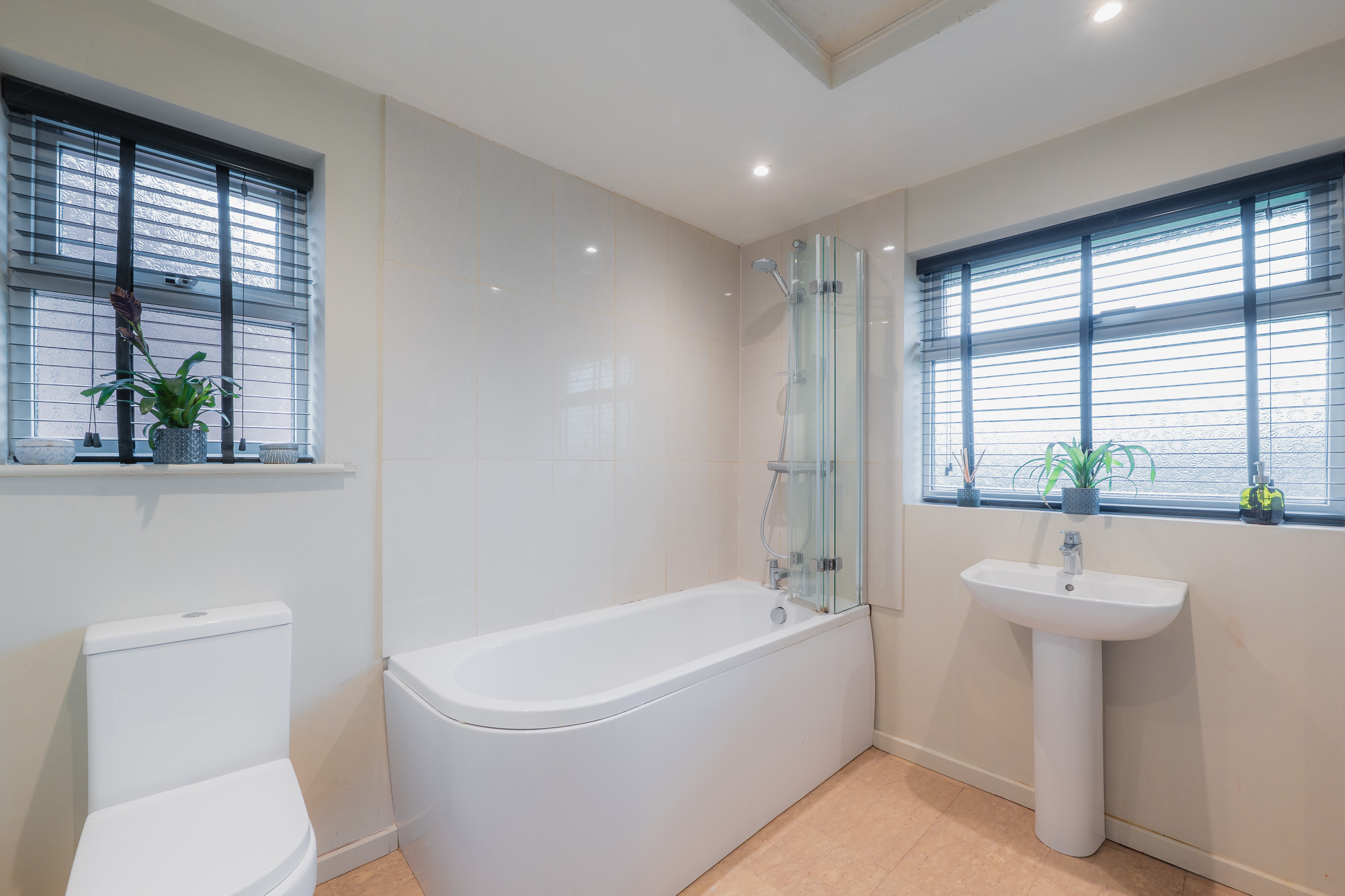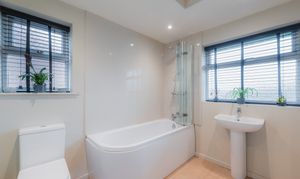 Limestone-effect Amtico flooring features in the bathroom next door, where a large bath with overhead shower invites indulgent soaks and relaxation.
